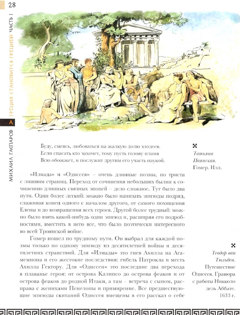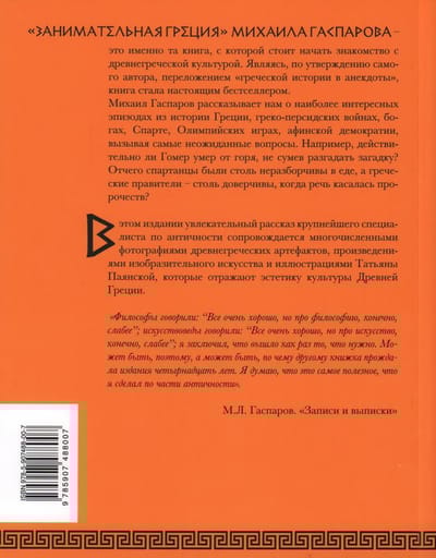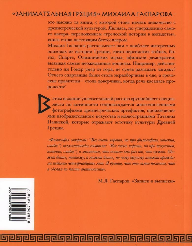 "Entertaining Greece" by Mikhail Gasparov is exactly the right book with which to begin your acquaintance with ancient Greek culture. Being, according to the author himself, a transposition of "Greek history into anecdotes", the book has become a real bestseller. Mikhail Gasparov tells us about the most interesting episodes from Greek history, the Greco-Persian wars, the gods, Sparta, the Olympic Games, Athenian democracy, raising the most unexpected questions. For example, did Homer really die of grief, unable to solve the riddle? Why were the Spartans so unscrupulous about food and Greek rulers so gullible when it came to prophecies? In this edition, the fascinating story of the largest expert on antiquity is accompanied by numerous photographs of ancient Greek artifacts, works of fine art and illustrations by Tatiana Payanskaya, which reflect the aesthetics of the culture of ancient Greece.