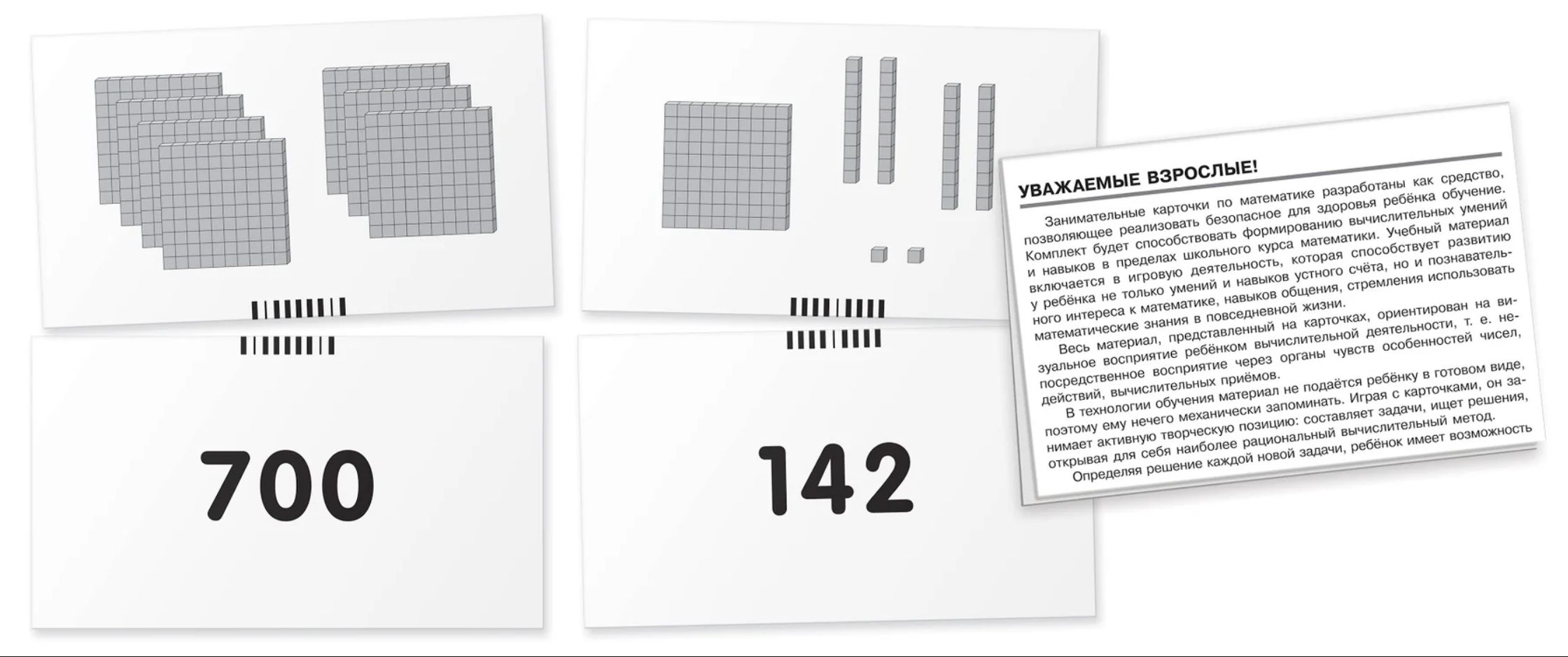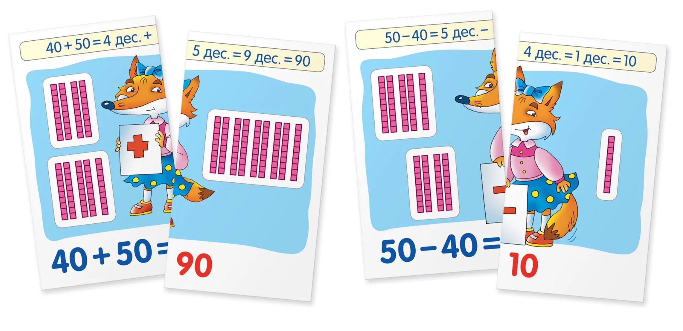 A set of cards that will help teach your child how to add, subtract, and compare numbers up to 100. While playing, your child will become familiar with place values and number classes and memorize basic arithmetic rules. The tasks are designed using a special methodology that not only helps them learn to count but also inspires a child's interest in mathematics and a desire to use mathematical knowledge in everyday life.