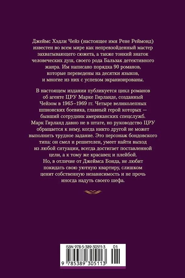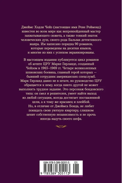 This edition features a series of novels about CIA agent Mark Girland, created by Chase between 1965 and 1969. Four superb spy thrillers, each starring a former American intelligence officer. Mark Girland has long been retired, but CIA leadership turns to him when no one else can complete a difficult assignment. He's a Bond-esque character: bold and decisive, able to find a way out of any situation, always achieving his goals, and, to top it all off, a handsome playboy. But, unlike James Bond, he doesn't like to leave his cozy apartment, values his independence too much, and isn't averse to occasionally outsmarting his boss.