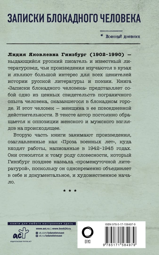 Lydia Yakovlevna Ginzburg (1902-1990) was an outstanding Russian writer and a famous literary scholar, whose works are studied at universities and are of great interest to all connoisseurs of the history of Russian literature and poetry. Her work "Notes of a Blockade Man" is one of the valuable testimonies of the borderline experience of a person who found herself in a city under siege. And this person is a woman in her everyday reality. In the text, the author constantly addresses the opposition of female and male views on what is happening. The second part of the book is occupied by works entitled "Prose of the war years", which includes works written in 1942-1945. These works belong to what Ginzburg later called "intermediate literature" because it combines both documentary and fiction.