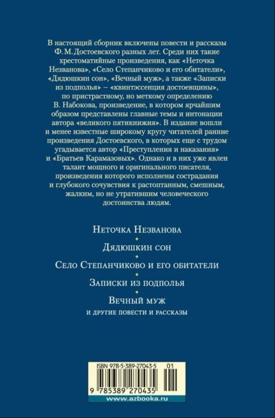 This collection includes stories and stories by F. M. Dostoevsky of different years. Among them are such textbook works as “Netochka Nezvanova”, “The village of Stepanchikovo and its inhabitants”, “Uncle’s Dream”, “Eternal Husband”, as well as “Notes from the Underground” – “Quintessence of the Desert”, according to the biased but apt definition of V. Nabokov, a work in which the main themes and intonations of the author of the “Great Five Books” are most vividly presented. The publication also includes the early works of Dostoevsky, which are less well known to a wide range of readers, in which the author of Crime and Punishment and The Brothers Karamazov are still difficult to guess. However, they already show the talent of a powerful and original writer, whose works are filled with compassion and deep sympathy for trampled, ridiculous, pathetic, but not lost human dignity people.