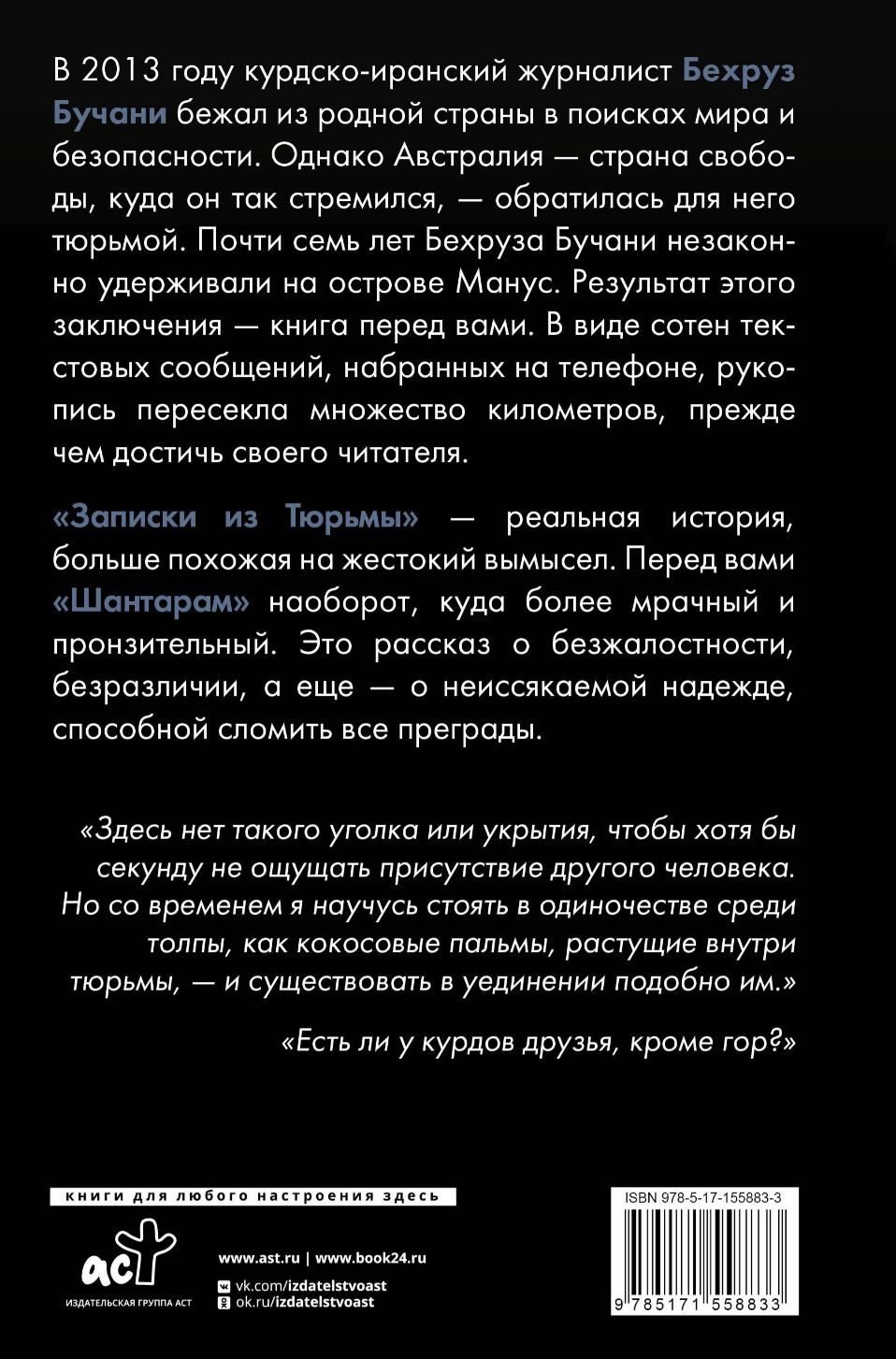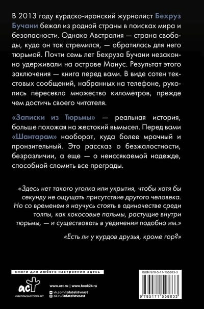 In 2013, Kurdish-Iranian journalist Behrouz Boochani fled his home country in search of peace and security. But Australia, the land of freedom he so longed for, turned him to prison. Behrouz Boochani was illegally detained on Manus Island for nearly seven years. The result of this conclusion is the book in front of you. In the form of hundreds of text messages typed on the phone, the manuscript traveled miles before reaching its reader.