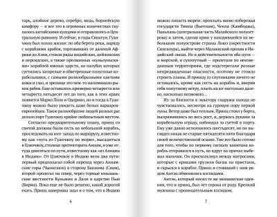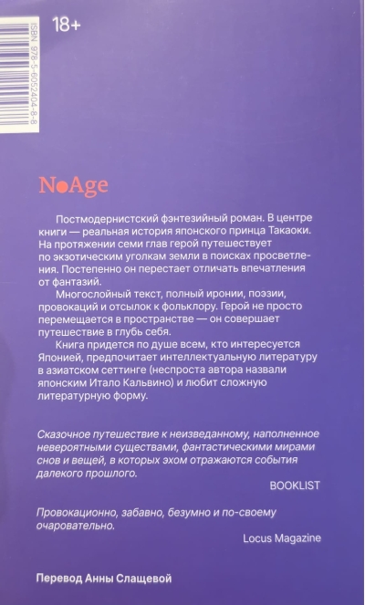 A postmodern fantasy novel. The book centers on the true story of the Japanese prince Takaoka. Over the course of seven chapters, the hero travels to exotic corners of the world in search of enlightenment. Gradually, he loses the ability to distinguish between impressions and fantasies.