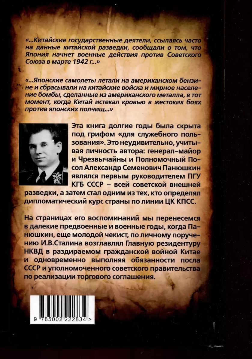 For many years this book was hidden under the "for official use" label. This is not surprising, given the author's personality: Major General and Ambassador Extraordinary and Plenipotentiary Alexander Semenovich Panyushkin was the first head of the USSR KGB PGU, the entire Soviet foreign intelligence service, and then became one of those who determined the country's diplomatic course through the CPSU Central Committee. On the pages of his memoirs we will be transported to the distant pre-war and war years, when Panyushkin, still a young Chekist, on Stalin's personal instructions headed the NKVD Main Residency in civil war-torn China and at the same time performing the duties of the USSR ambassador and the Soviet government's commissioner for the implementation of the trade agreement.
