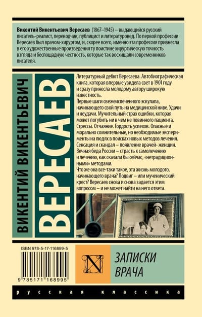Veresaev's literary debut. An autobiographical book that first saw the light of day in 1901 - and immediately brought the young author wide fame. The first steps of a freshly baked esculapist, beginning his journey in the medical field. Fortunes and failures. The agonizing fear of error, which could ruin an innocent patient. Stress. Despair. The pride of success. Dangerous and morally questionable but necessary experiments on human beings, in search of new treatments. Sensation and scandal - the emergence of female doctors. The eternal misfortune of Russia - the passion for self-medication and "treatment", as they would say now, "unconventional" methods. What is it all the same, this life of a young, novice doctor? A feat - or a martyr's cross? Veresaev asks himself this question again and again - and cannot find an answer.