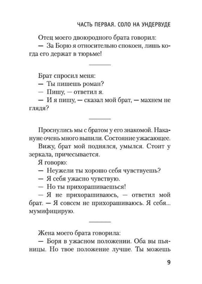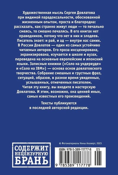 The artistic idea of Sergei Dovlatov, while apparently paradoxical, justified by life experience, is simple and noble: to tell how strangely people live - then laughing sadly, then laughing sadly. There are no righteous people in his books, because there are no villains in them either. The writer knows that both heaven and hell are inside us. In Russia, Dovlatov is one of the most consistently read authors. His prose is dramatized, screened, studied in schools and universities, translated into major European and Japanese languages.Notebooks ("Solo on the Underwood" and "Solo on the IVM") - the basis of Dovlatov's work. A collection of funny and sad phrases, situations, images, at different times seen, heard, noted by the writer. Reading this book, you enter Dovlatov's workshop. And with this, perhaps, it is more valuable than other, the most famous of his works.