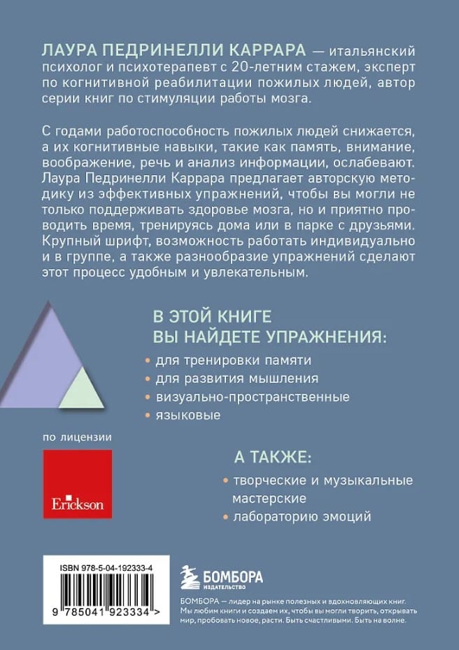 As people age, their performance declines, and their cognitive skills, such as memory, attention, imagination, speech, and information processing, weaken. Laura Pedrinelli Carrara offers a unique method of effective exercises so you can not only maintain brain health but also have a pleasant time exercising at home or in the park with friends. Large print, the ability to work individually or in a group, and a variety of exercises make this process convenient and engaging.
