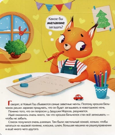 A good instructive fairy tale “The cherished desire” of the modern author Irina Zartaiskaya is bright illustrations, original text, colorful large windows that help to plunge into the New Year atmosphere. Together with Squirrel, your baby will plunge into the pre-holiday atmosphere, will prepare for the New Year, decorate a tree, dream about gifts... And she will discover what can be more important than gifts, how important it is to appreciate your loved ones, and how people sometimes need support and attention. Read the book with windows "The cherished desire" - go on a good New Year's adventure!