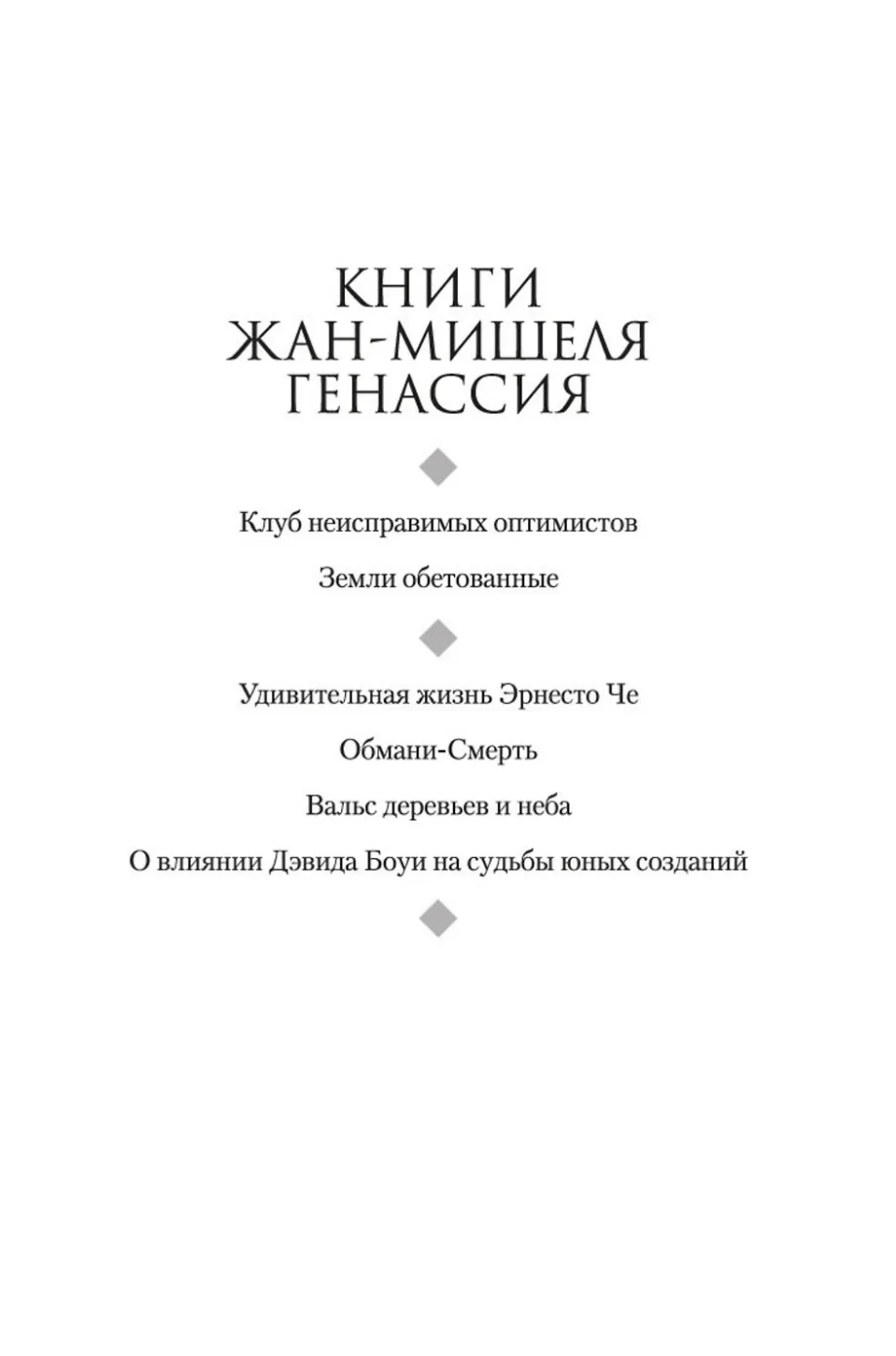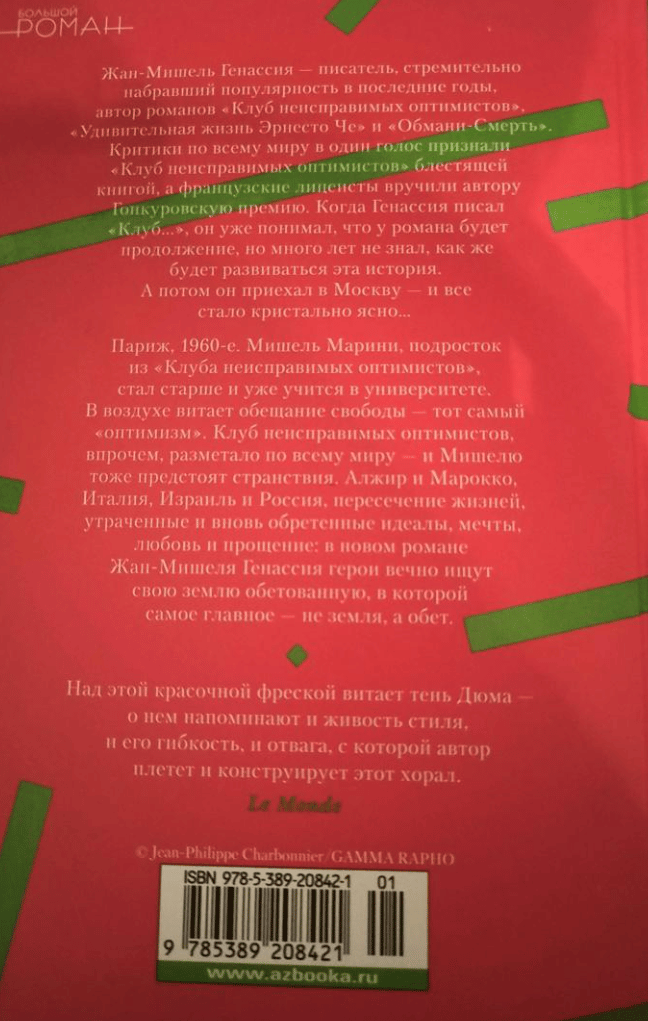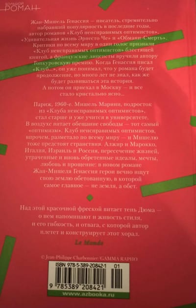 Jean-Michel Ghenassia is a writer who has rapidly gained popularity in recent years, the author of the novels The Club of Incorrigible Optimists, The Amazing Life of Ernesto Che and Cheat-Death. Critics around the world have unanimously recognized The Club of Incorrigible Optimists as a brilliant book, and French high school students awarded the author the Goncourt Prize. When Ghenassia wrote The Club, he already understood that the novel would have a sequel, but for many years he did not know how this story would develop. And then he came to Moscow - and everything became crystal clear ... Paris, 1960s. Michel Marini, a teenager from the "Club of Incorrigible Optimists", has grown older and is already studying at the university. In his life and in the whole world, a romantic period has come, an innocent time of love and hope. The promise of freedom is in the air - that very "optimism". The Club of Incorrigible Optimists, however, has been scattered all over the world – and Michel too will have to travel in search of his personal dreams and utopias of the entire 20th century. Algeria and Morocco, Italy, Israel and Russia, the intersection of lives, lost and regained ideals, dreams, love and forgiveness: in the new novel by Jean-Michel Guenassia, a continuation of “The Club of Incorrigible Optimists”, the heroes are eternally searching for their promised land, in which the most important thing is not the land, but the promise.