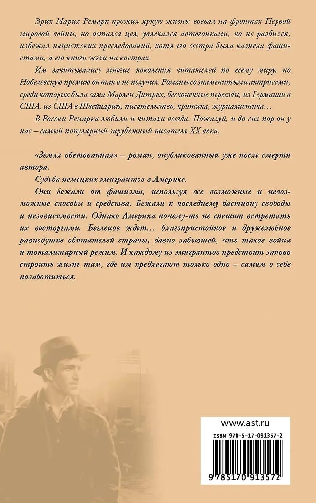 "The Promised Land" is a novel published after the author's death. It follows the fate of German emigrants to America. They fled fascism, using every possible and impossible means and methods. They fled to the last bastion of freedom and independence. However, America, for some reason, is in no hurry to greet them with enthusiasm. What awaits the fugitives is... the decent and friendly indifference of the inhabitants of a country that has long forgotten what war and totalitarian rule are. And each of the emigrants must rebuild their lives in a place where they are offered only one thing: to fend for themselves.