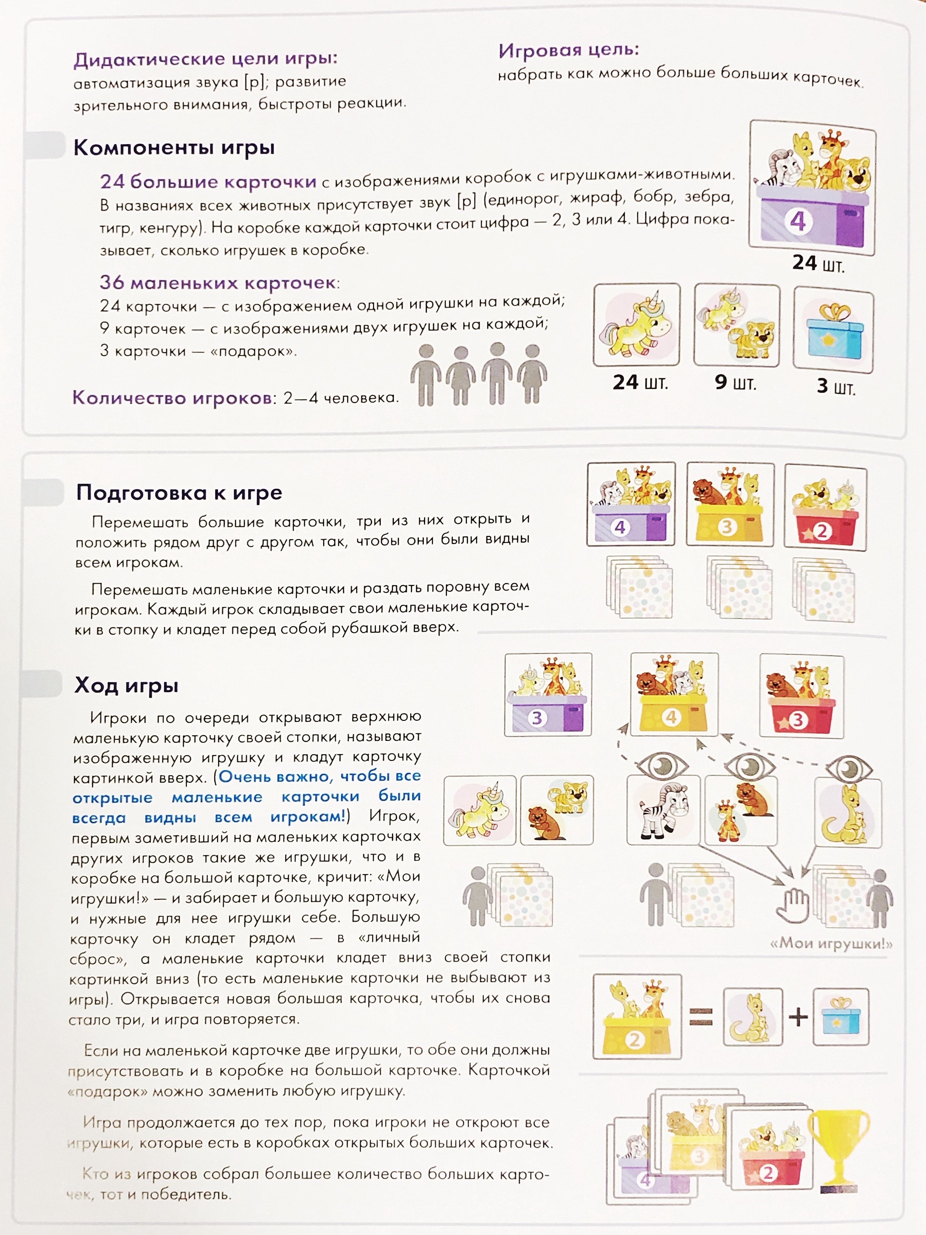 The didactic game includes colored cards with pictures of animal toys with the sound [p] in their names. The game can be played by 2-4 people. Didactic goals of the game: automatization of the sound [p]; development of visual attention, quick reaction time; education of the ability to play with peers. The manual is intended for educators, teachers of preschool educational institutions and parents for joint play with preschool children.