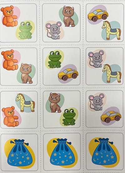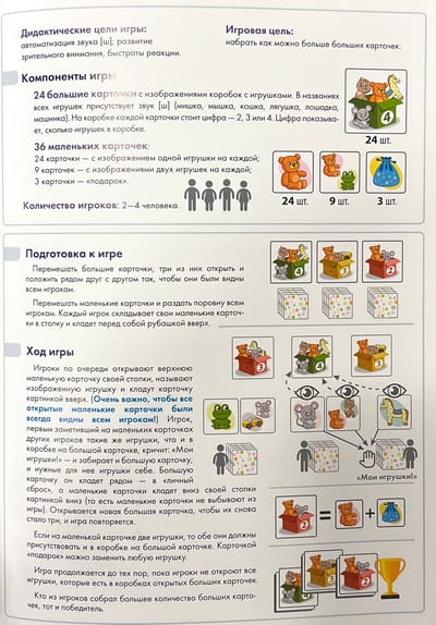 The didactic game includes colored cards with pictures of toys with the sound [sh] in their names. The game can be played by 2-4 people. Didactic goals of the game: automatization of the sound [sh]; development of visual attention, quick reaction time; teaching the ability to play with peers.