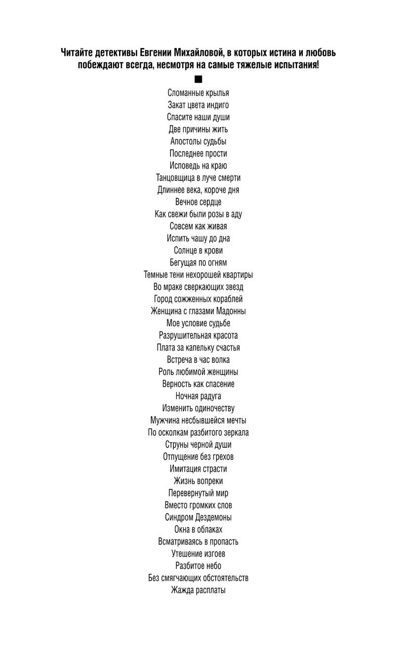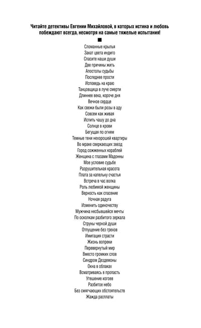 Employees of the firm, where Dasha and Vlad work, are aware of their relationship. They also know that Dasha's boss is desperately and unrequitedly in love with Vlad... The storm of passions turns upside down not only their private life, but also the whole holding. Without wanting to, lovers become the culprits of a series of tragedies, which can only be stopped by an experienced private detective Sergei Koltsov... In the past, Eugenia Mikhailova worked as a journalist and conducted many journalistic investigations, and now composes crimes herself. But non-fictional life stories still serve as inspiration for Eugenia, and it is on real events she bases her plots. Each of her suspenseful novels is a real detective-event.