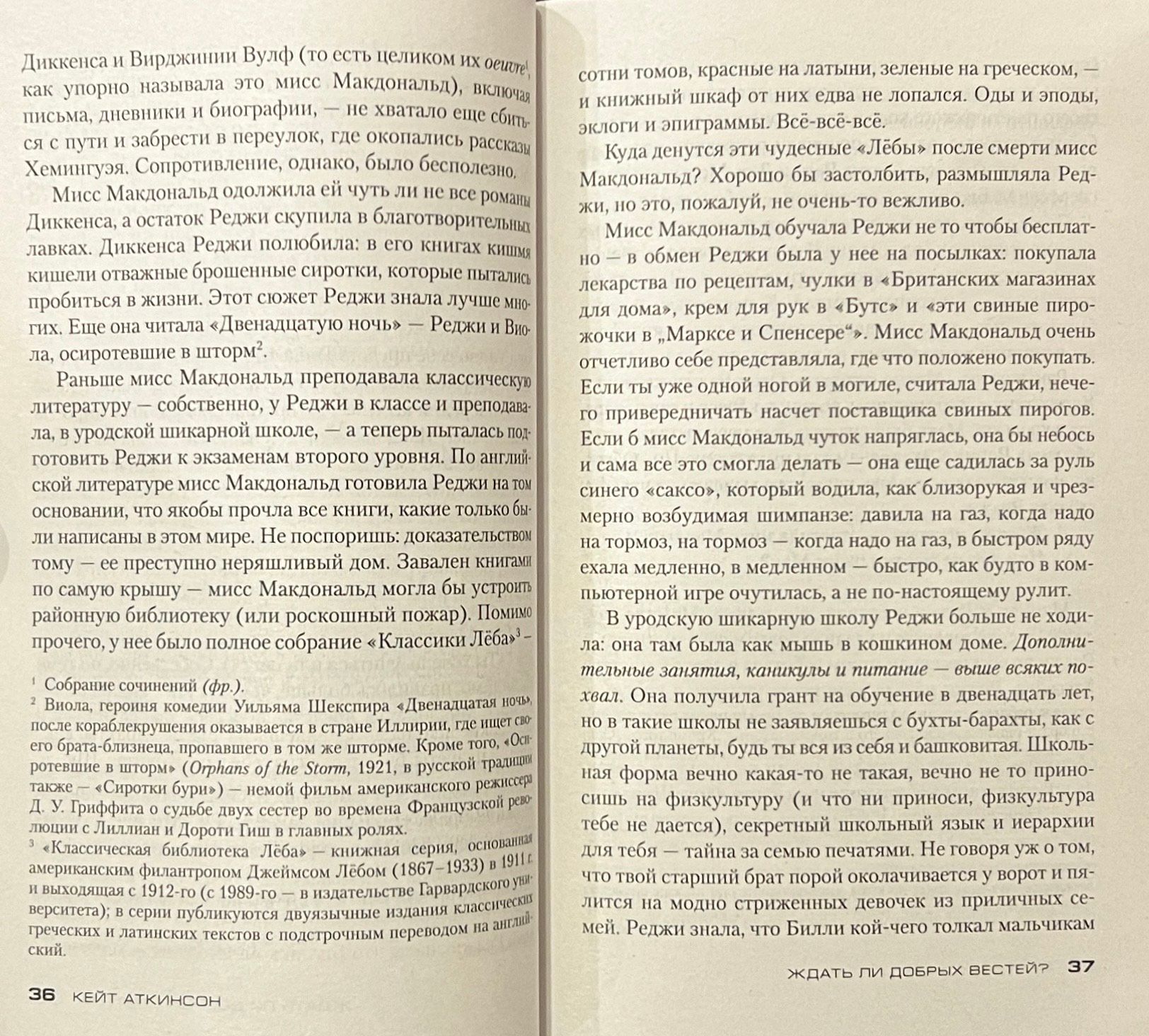 In the novel "Do I Expect Good News?" action takes place not in the university Cambridge and not among the crowds of tourists who came to the Edinburgh Festival, although the Scottish capital again provides a picturesque backdrop to the events. And the impetus for them was a nightmarish crime of thirty years ago, which shook the quiet Devonshire and the whole of England; and now the convicted murderer, having served his time, goes free. Meanwhile, Dr. Trapper goes missing with a small child - but her disappearance seems to have alarmed only her sheepdog, Sadie, and her sixteen-year-old babysitter, Reggie. And DCI Louise Monroe is preoccupied with another missing person - not yet knowing that Jackson Brodie is about to burst into her life again, and at full speed (literally).