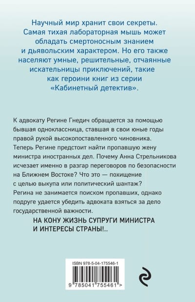 Lawyer Regina Gnedich is asked for help by a former classmate, who in her younger years became the right hand of a high-ranking official. Now Regina has to find the missing wife of the Minister of Foreign Affairs. Why does Anna Strelnikova disappear exactly in the midst of security talks in the Middle East? Is it a kidnapping for ransom or political blackmail? Regina is not engaged in the search for the missing, but her friend manages to convince a lawyer to take on a case of national importance. The life of the minister's wife and the interests of the country are at stake!...