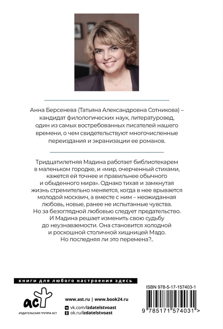Thirty-year-old Madina works as a librarian in a small town, and "the world outlined by poems seems to her more accurate and correct than the usual and ordinary world. However, her quiet and withdrawn life changes rapidly when a young Muscovite bursts into it, and with him unexpected love and new, previously untried feelings. But unconditional love is followed by betrayal. And Madina decides to change her fate beyond recognition. She becomes a cold and luxurious capital predator Mado. But will it be the last change?