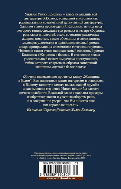 William Wilkie Collins - a classic of English literature of the XIX century, who went down in history as the founder of modern detective literature. The key to the success of the works of Collins, from the pen of which came out twenty-three novels and four collections of short stories and novellas, was a combination of different genres: the writer skillfully combined in his books melodrama, detective and moral novel, generously seasoning them with elements of the gothic novel. It is in this style is written the most famous novel Collins, "The Woman in White". It is based on a fascinating plot about a dark crime, the mystery of which is hidden behind the image of a mysterious woman dressed in a white dress.