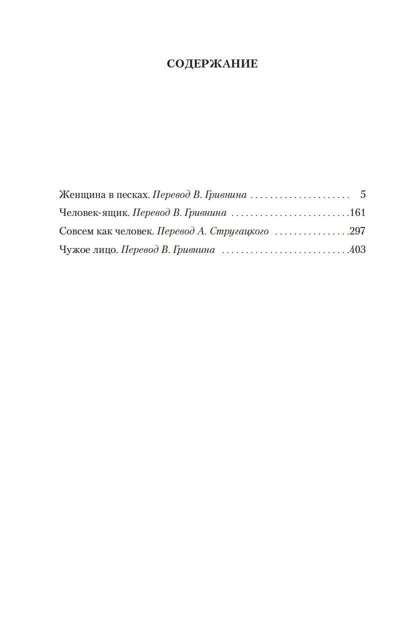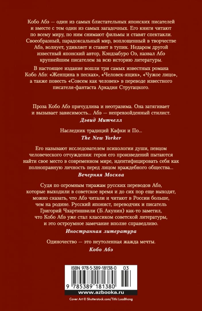 This edition includes three of Kobo Abe's most famous novels: "Woman in the Sands", "The Man-Box", "The Stranger's Face", as well as the story "Quite Like a Man" translated by the famous science fiction writer Arkady Strugatsky.