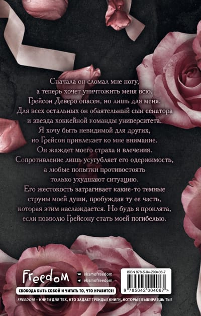 Grayson Devereaux is dangerous, but only to me. To everyone else, he is the charming son of a senator and star of the university hockey team. I want to be invisible to others, but Grayson gets attention. He craves my fear and attraction. Resistance only exacerbates his obsession, and any attempts to resist only make things worse. His cruelty touches some dark strings of my soul, awakening the part of my soul that enjoys it. But I'll be damned if I let Grayson be my doom.