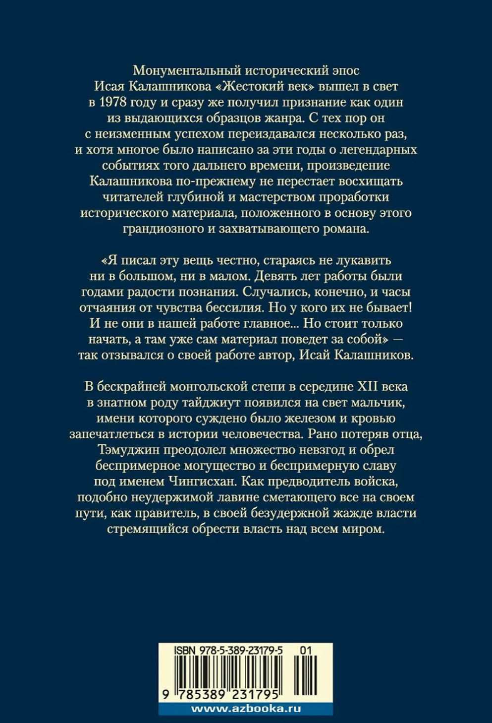 The monumental historical epic by Isai Kalashnikov, The Cruel Age, was published in 1978 and immediately received recognition as one of the outstanding examples of the genre. Since then, it has been republished several times with unfailing success, and although much has been written over the years about the legendary events of that distant time, Kalashnikov's work continues to delight readers with the depth and mastery of the historical material that forms the basis of this grand and exciting novel. In the endless Mongolian steppe in the middle of the 12th century, a boy was born into a noble Taijiut family, whose name was destined to be imprinted in the history of mankind with iron and blood. Having lost his father early, Temujin overcame many adversities and gained unparalleled power and unparalleled glory under the name of Genghis Khan. As the leader of an army, like an unstoppable avalanche sweeping away everything in its path, as a ruler, in his unbridled thirst for power striving to gain power over the whole world.