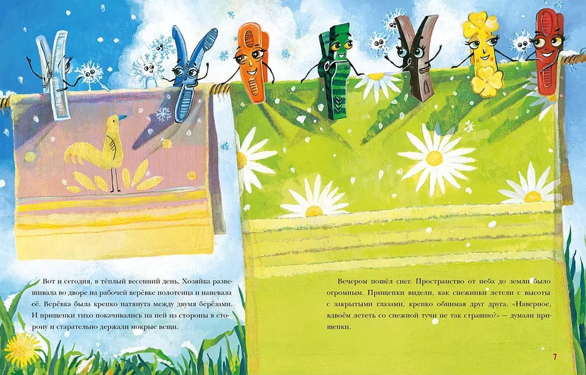 The colorful clothespins have a tough job. Is it a joke to hold laundry tightly on a clothesline during a snowstorm? And what happens if a caterpillar tickles the clothespin at the most crucial moment? And what is it like to play rainbow with a little person? Everyone loves adventures! And clothespins are no exception!