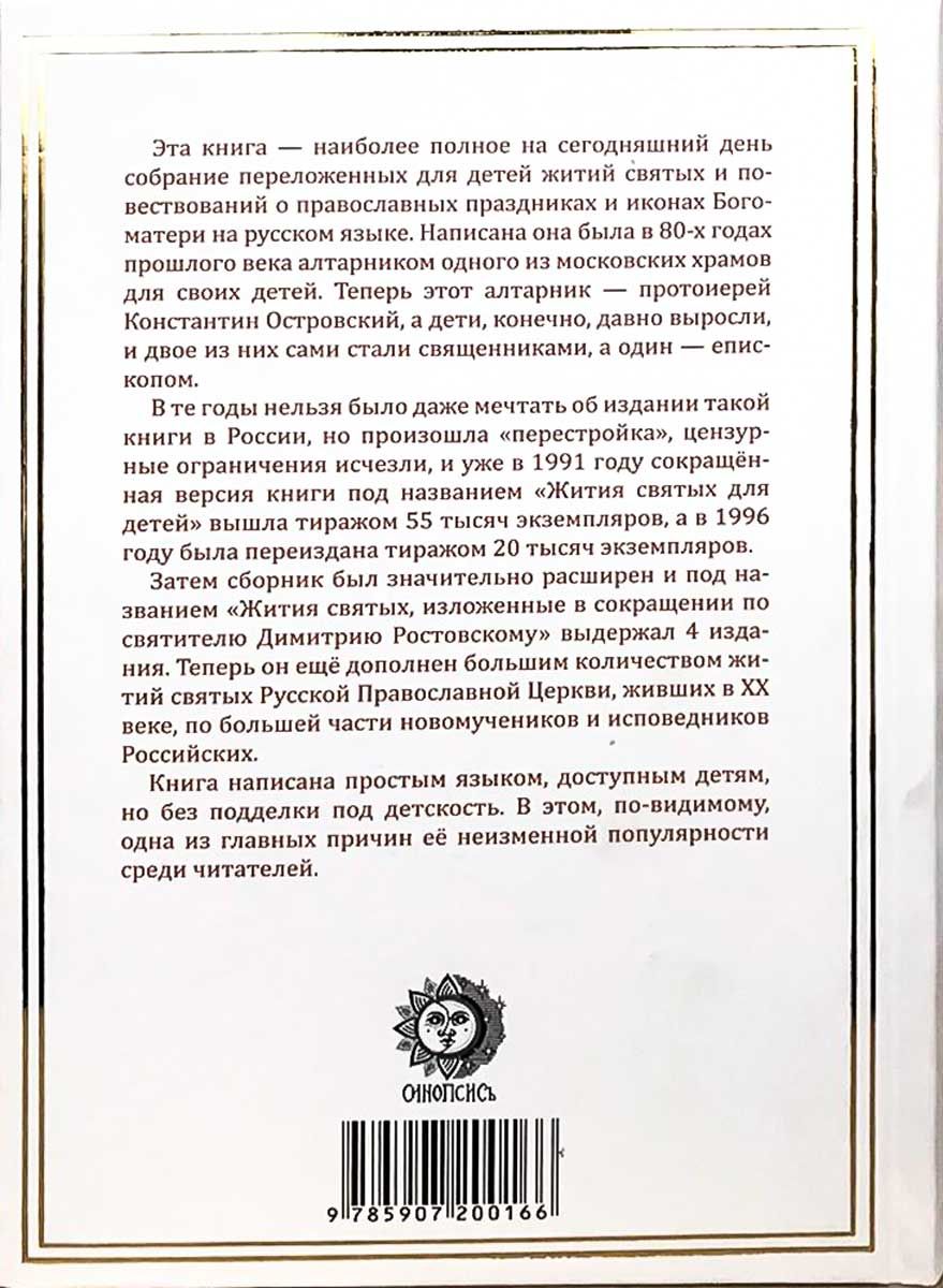This book is the most complete collection of the lives of saints for children and narratives about Orthodox holidays and icons of the Mother of God in Russian. It was written in the 80s of the last century by an altarman of one of the Moscow churches for his children. Now this altarman is Archpriest Konstantin Ostrovsky, and the children, of course, have long grown up, and two of them became priests themselves, and one became a bishop.