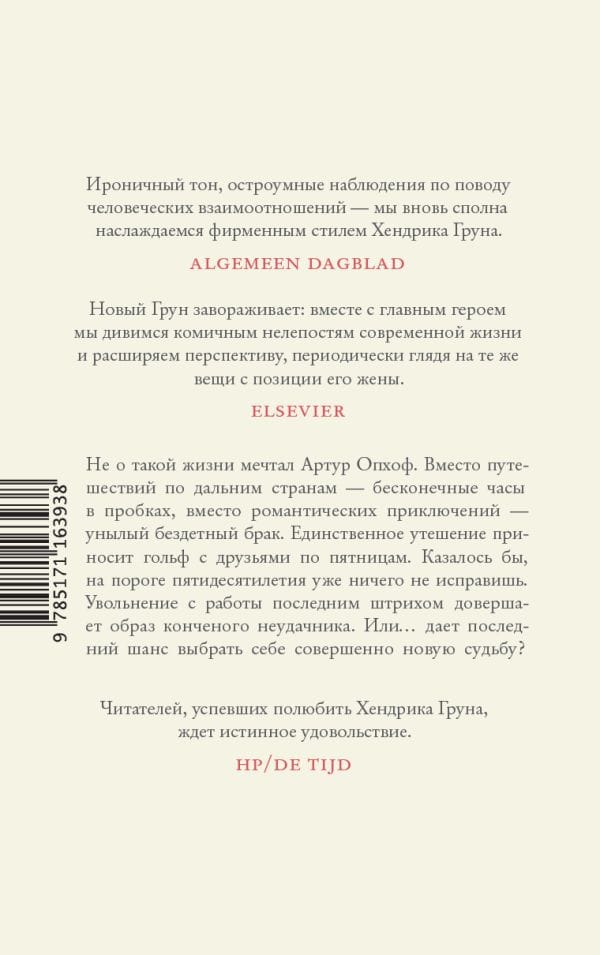 As readers know, Hendrik Gruhn himself hates boredom and doesn't let others have it. Therefore, his third novel presents a completely new story, completely unrelated to the Amsterdam almshouse. This time, we won't meet Gruhn in person, but judging by his merciless observations and inimitable irony, he's lingering nearby, spying... Arthur Ophoff is disillusioned. He's about to turn fifty, and his life is synonymous with despondency. A boring job, a boring marriage without children or passion, boring hours stuck in traffic jams instead of long journeys to exotic destinations and the thrills he'd dreamed of so much. A game of golf with friends on Friday is the highlight of the week. And then, on top of that, he's been unfairly fired. It's time to give up on himself... or devise a cunning plan for a radical change in his fate.