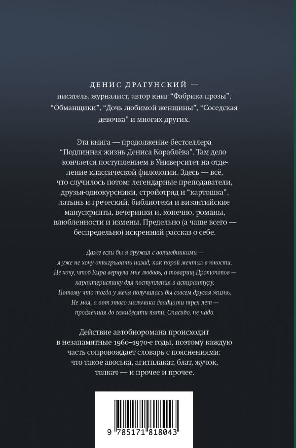 This book is a sequel to the bestseller "The Real Life of Denis Korablyov." There, the story ends with his admission to the University's classical philology department. Here is everything that happened afterward: legendary professors, fellow students, a construction brigade and "potatoes," Latin and Greek, libraries and Byzantine manuscripts, parties, and, of course, romances, love affairs, and betrayals. An utterly (and often, infinitely) sincere account of myself.
