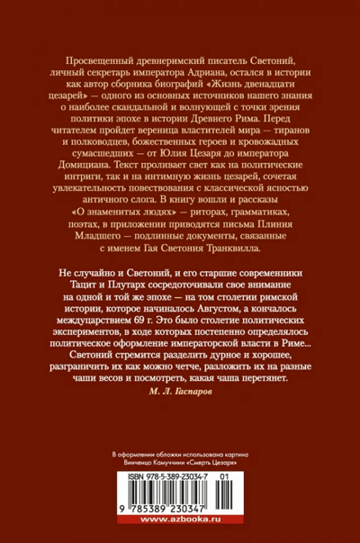 The enlightened ancient Roman writer Suetonius, personal secretary to Emperor Hadrian, has remained in history as the author of the collection of biographies "The Lives of the Twelve Caesars" - one of the main sources of our knowledge about the most scandalous and politically exciting era in the history of ancient Rome. A string of world rulers - tyrants and generals, divine heroes and bloodthirsty madmen - from Julius Caesar to Emperor Domitian, will pass before the reader. The text sheds light on both the political intrigues and the intimate lives of the Caesars, combining fascinating narrative with the classic clarity of the ancient syllable. The book also includes stories "On Famous Men" - rhetors, grammarians, poets; the appendix contains the letters of Pliny the Younger - authentic documents related to the name of Gaius Suetonius Tarquinius.