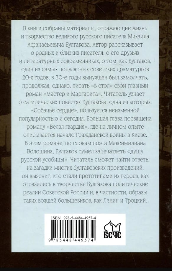 The book contains materials reflecting the life and work of the great Russian writer Mikhail Afanasyevich Bulgakov. The author talks about the writer's family and friends, his friends and literary contemporaries, about how Bulgakov, one of the most popular Soviet playwrights of the 1920s, was forced to remain silent in the 1930s, but continued to write his main novel, The Master and Margarita, "for the drawer". The reader will learn about Bulgakov's satirical stories, one of which, "Heart of a Dog", enjoys continued popularity today. A large chapter is devoted to the novel "The White Guard", which describes the beginning of the Civil War in Kyiv from personal experience. In this novel, according to the poet Maximilian Voloshin, Bulgakov managed to capture "the soul of Russian strife". The reader will be able to find answers to the mysteries of many of Bulgakov's works, he will find out who became the prototypes of their heroes, how the political realities of Soviet Russia and, in particular, the images of such Bolshevik leaders as Lenin and Trotsky were reflected in Bulgakov's works.