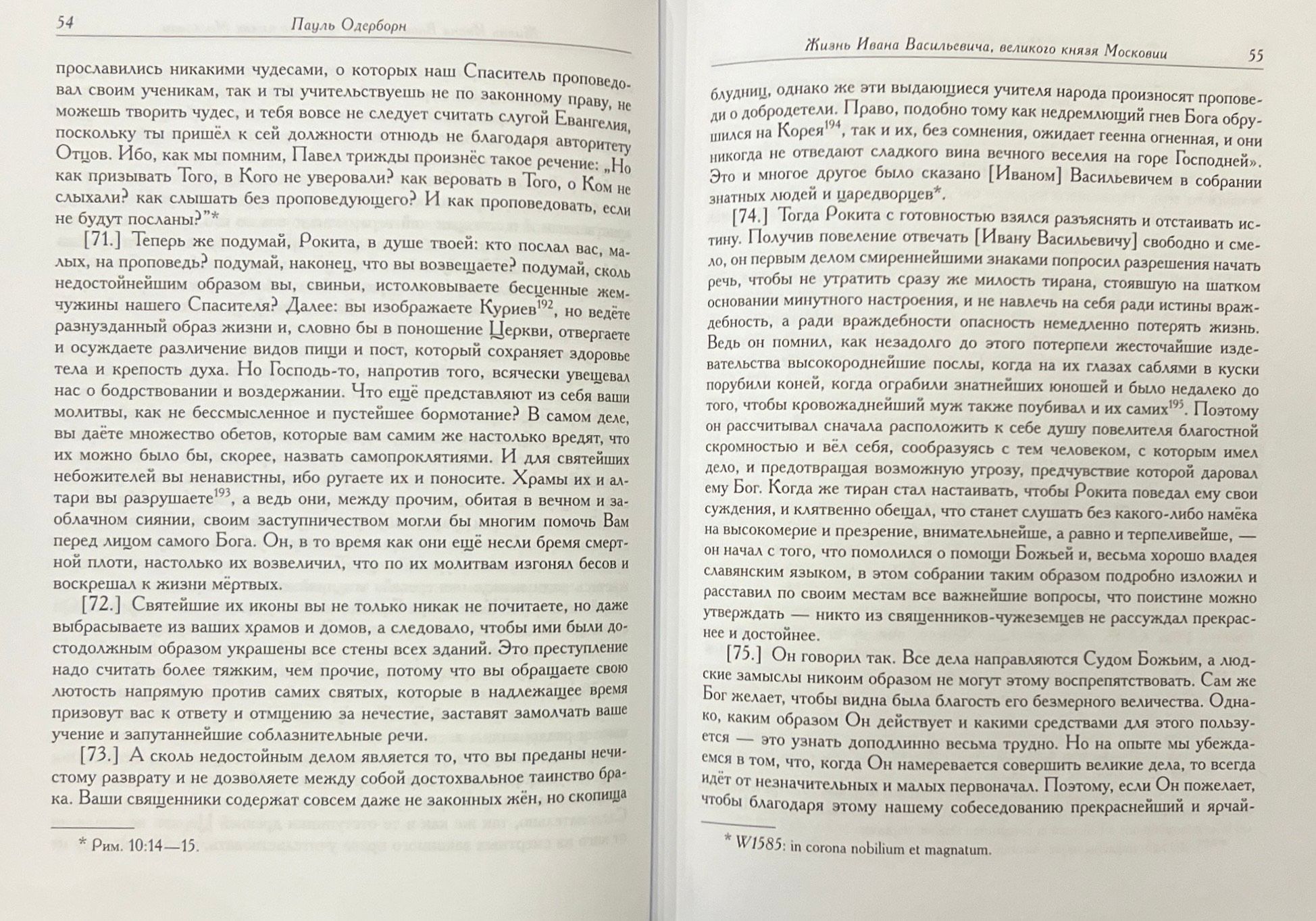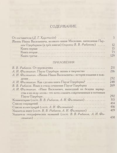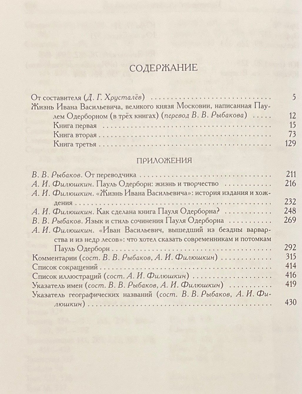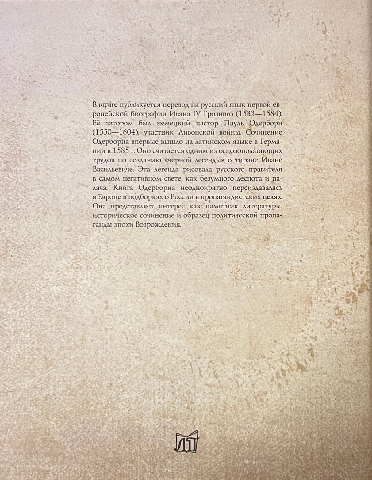The book contains a translation into Russian of the first European biography of Ivan IV the Terrible (1533-1584). Its author was the German pastor Paul Oderborn (1550-1644), a participant in the Livonian War. Oderborn's work was first published in Latin in Germany in 1585. It is considered one of the fundamental works on the creation of the "black legend" about the tyrant Ivan Vasilyevich. This legend painted the Russian ruler in the most negative light, as a mad despot and executioner.