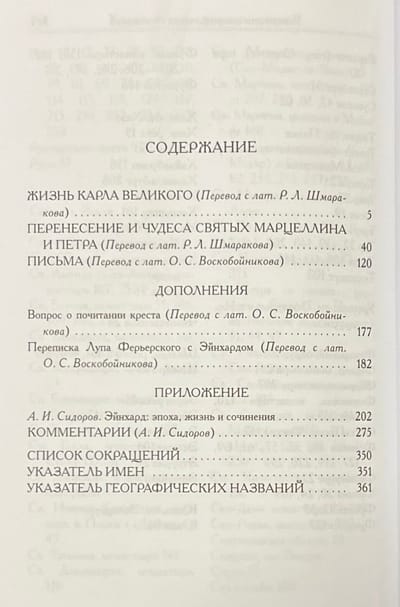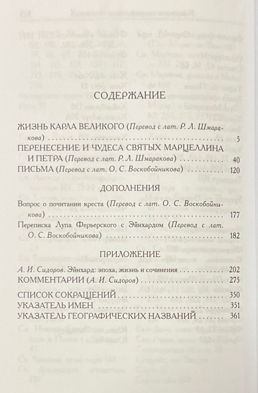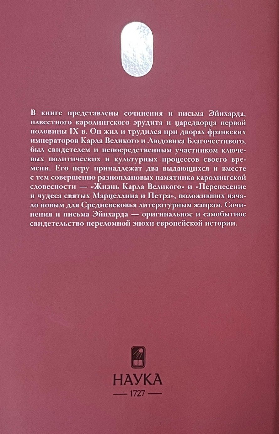 The book presents the writings and letters of Einhard, a famous Carolingian polymath and royalist of the late 8th - first half of the 9th century. He lived and worked at the courts of the Frankish emperors Charlemagne and Louis the Pious, and was a witness and direct participant in the key political and cultural processes of his time. He wrote two outstanding and at the same time completely diverse monuments of Carolingian literature - "The Life of Charlemagne" and "The Transfer and Miracles of St. Marcellinus and St. Peter", which laid the foundation for literary genres new for the Middle Ages. Einhardt's writings and letters are original and original testimony to a pivotal epoch in European history.