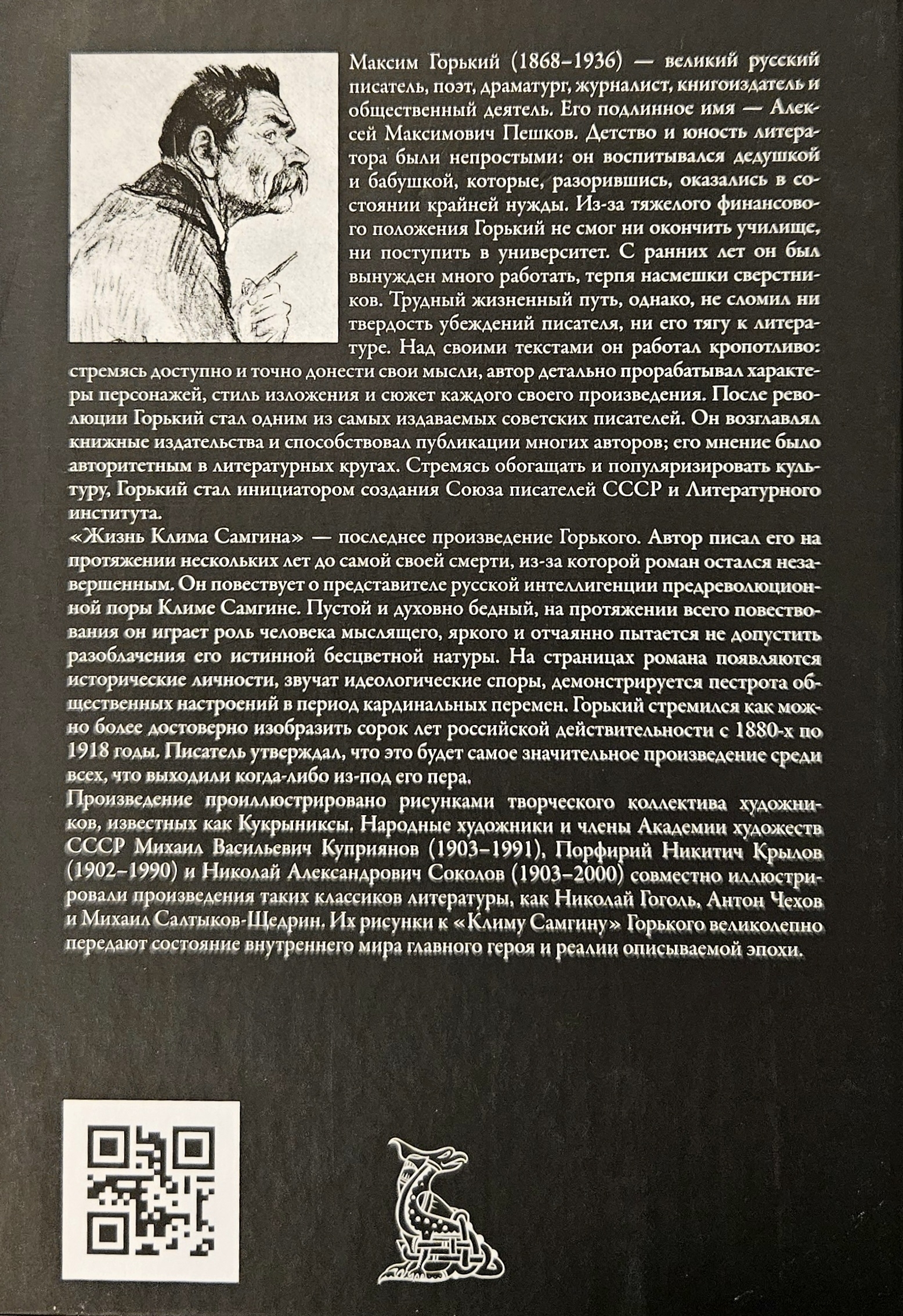 "The Life of Klim Samgin" is the last work of the famous Russian writer Maxim Gorky (1868-1936), who made a significant contribution to the development of Soviet literature. As the events of the novel unfold, its main character, Klim Samgin, a man of not the most outstanding intelligence, completely devoid of individuality, desperately tries to present himself as a bright, deep person in the eyes of others. The novel is decorated with illustrations by three artists who worked under the pseudonym Kukryniksy. Drawings by Mikhail Vasilyevich Kupriyanov (1903-1991), Porfiry Nikitich Krylov (1902-1990) and Nikolai Aleksandrovich Sokolov (1903-2000) will help the reader to penetrate the depth of Maxim Gorky's magnificent novel.