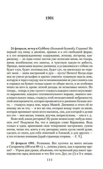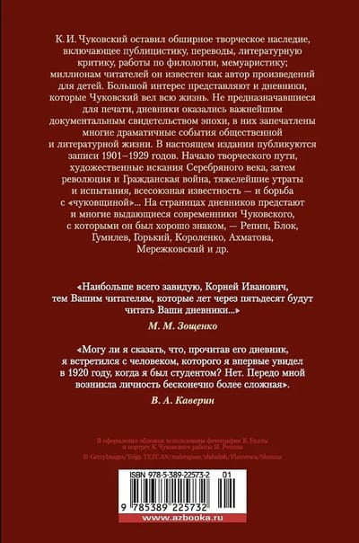 K. I. Chukovsky left behind a vast creative legacy, including journalism, translations, literary criticism, works on philology, and memoirs. Of great interest are the diaries he kept throughout his life. This edition features entries from 1901–1929. The beginning of his creative career, the artistic explorations of the Silver Age, then the Revolution and Civil War, the gravest losses and trials, nationwide fame—and the struggle against "Chukovskyism"... The diaries also feature many of Chukovsky's outstanding contemporaries, with whom he was well acquainted—Repin, Blok, Gumilev, Gorky, Korolenko, Akhmatova, Merezhkovsky, and others.