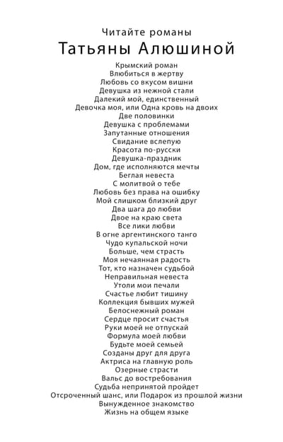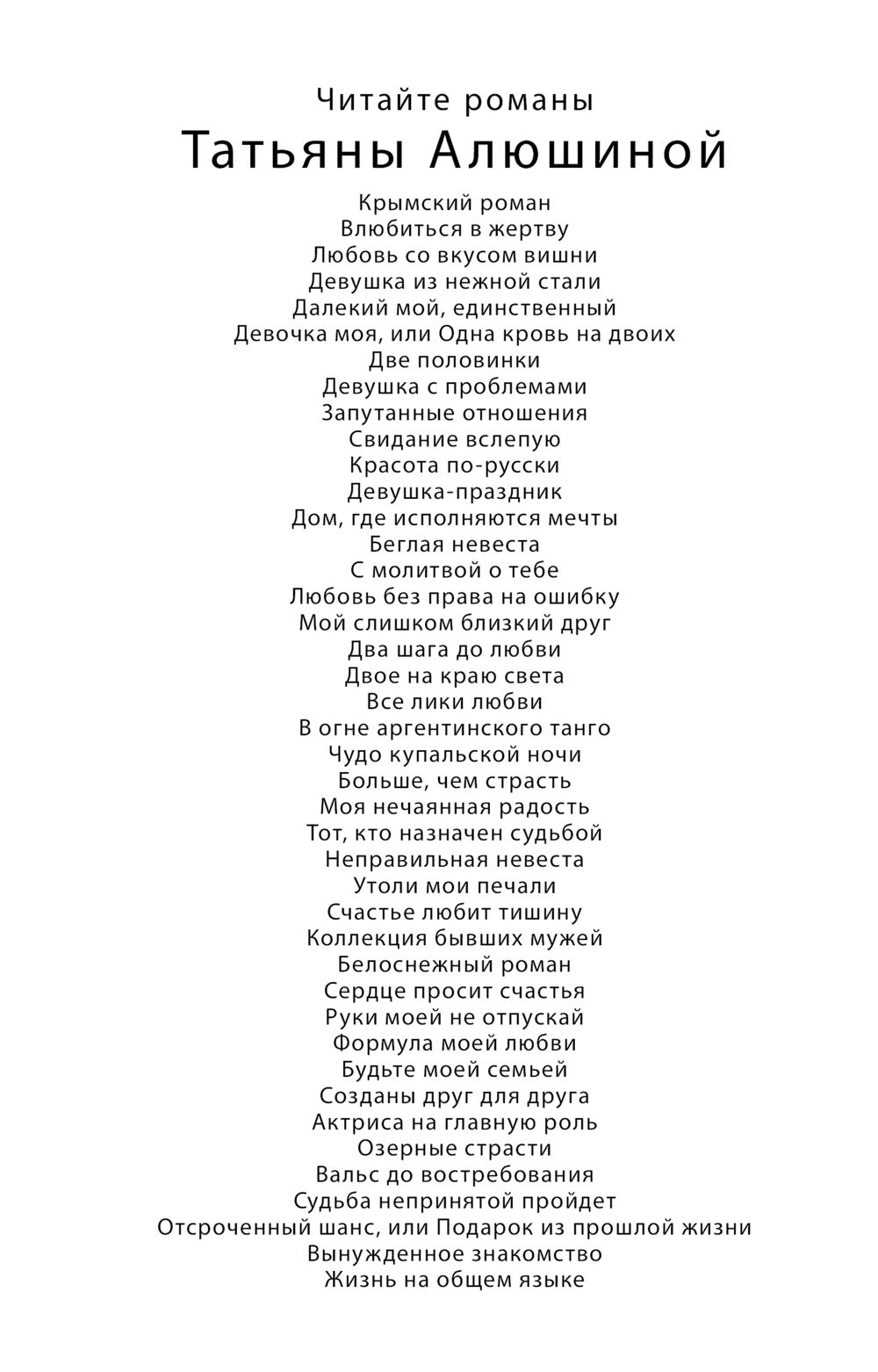 Before the reader unfolds an amazing love story, originating in the childhood of the characters. But just meeting after many years is not enough. Matvey and Claudia are shocked by the flashed feeling, but they are adults, and the miracle that happened should not only be admired, it must be able to save. Interesting fates, complex characters, heroine with the gift of foresight - all this in a wonderful new book by Tatiana Alyushina.