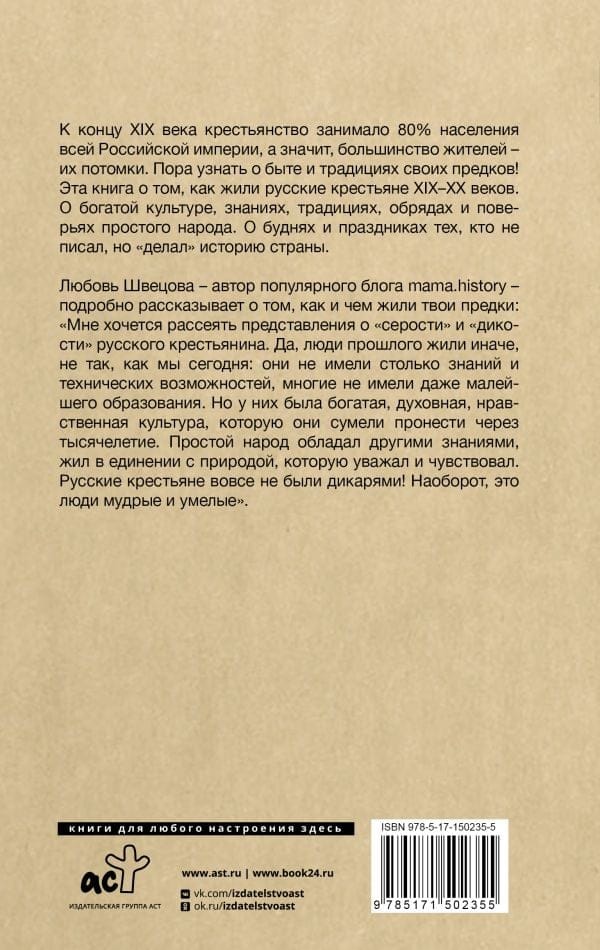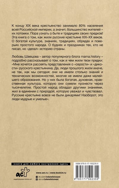 By the end of the XIX century, the peasantry occupied 80% of the population of the entire Russian Empire, which means that most of the inhabitants of modern Russia are their descendants. It is time to learn about the life and traditions of your ancestors! This book is about how Russian peasants lived in the XIX - XX century. About the rich culture, knowledge, traditions, rituals and beliefs of ordinary people. About the everyday life and holidays of those who did not write, but "made" the history of the country. Lubov Shvetsova - author of the popular blog mama.history in the book "Life and traditions of the Russian peasantry" tells in detail about how and what your ancestors lived: "I want to dispel the notions of "grayness" and "wildness" of the Russian peasant. Yes, people of the past lived differently, not as we do today: they did not have as much knowledge and technical capabilities, many did not have even the slightest education. But they had a rich, spiritual, moral culture, which they managed to carry through the millennium. The common people had other knowledge, lived in unity with nature, which they respected and felt. Russian peasants were not savages at all! On the contrary - they were people of wisdom and skill".