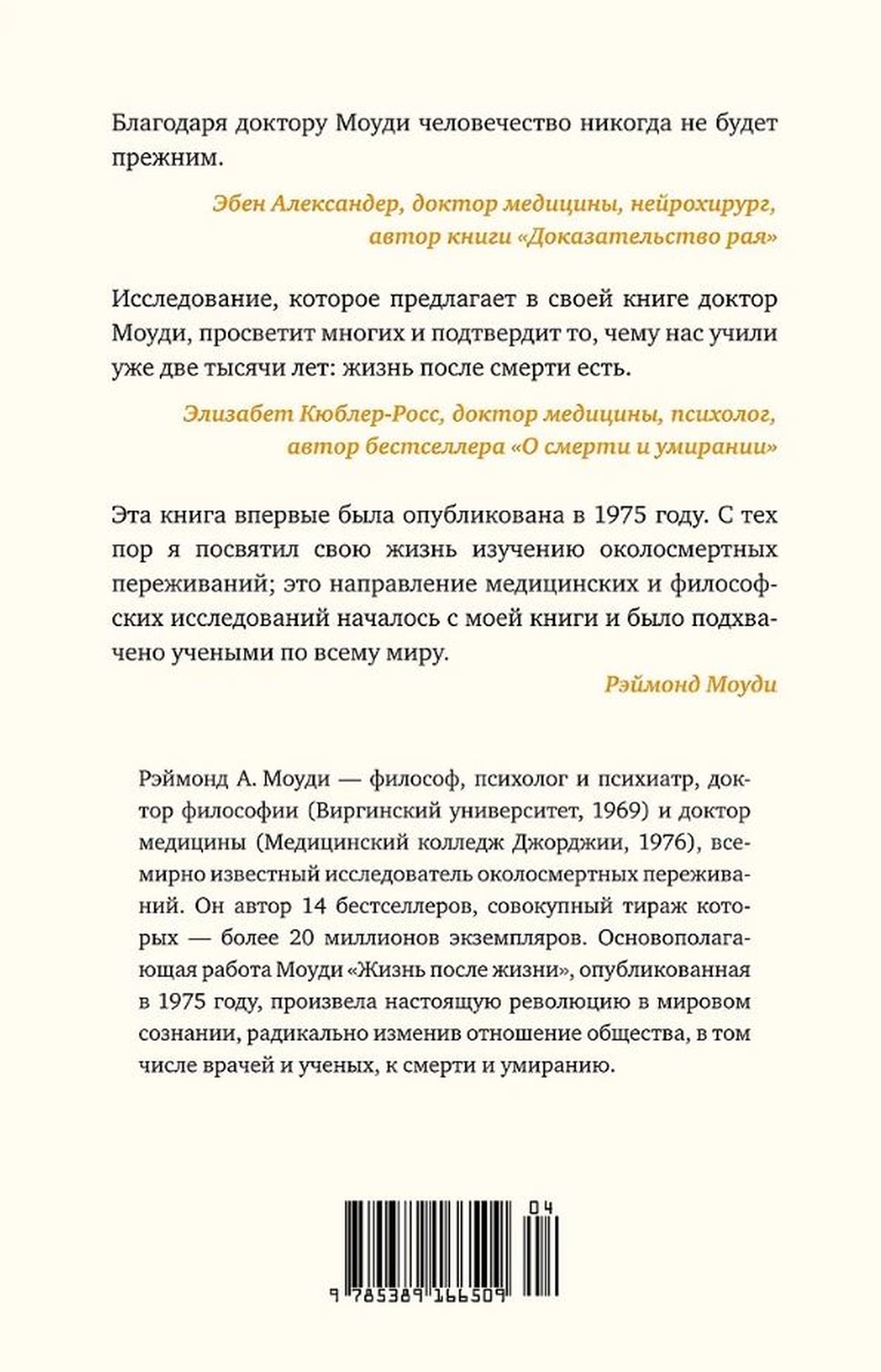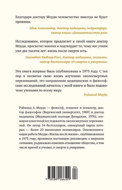In his unique work, Raymond Moody - philosopher, psychologist and psychiatrist - for the first time described and investigated the so-called near-death experience, or near-death experiences. He analyzed more than a hundred accounts from patients who had experienced clinical death and identified common motifs recurring in their stories, such as a loud hum, a bright light, a tunnel, leaving the physical body, encounters with deceased loved ones waiting "on the other side" and with certain beautiful luminous beings, a retrospective review of a lifetime, and an unwillingness to return back to our world.... First published in 1975, this book immediately became a worldwide bestseller and forever changed society's attitude not only to death and dying, but also to life. This edition includes a classic foreword by psychiatrist Elisabeth Kübler-Ross - the creator of the concept of hospice care for the dying - and a new foreword by neurosurgeon Eben Alexander, as well as an anniversary afterword by the author, written 40 years after the first publication of the book.