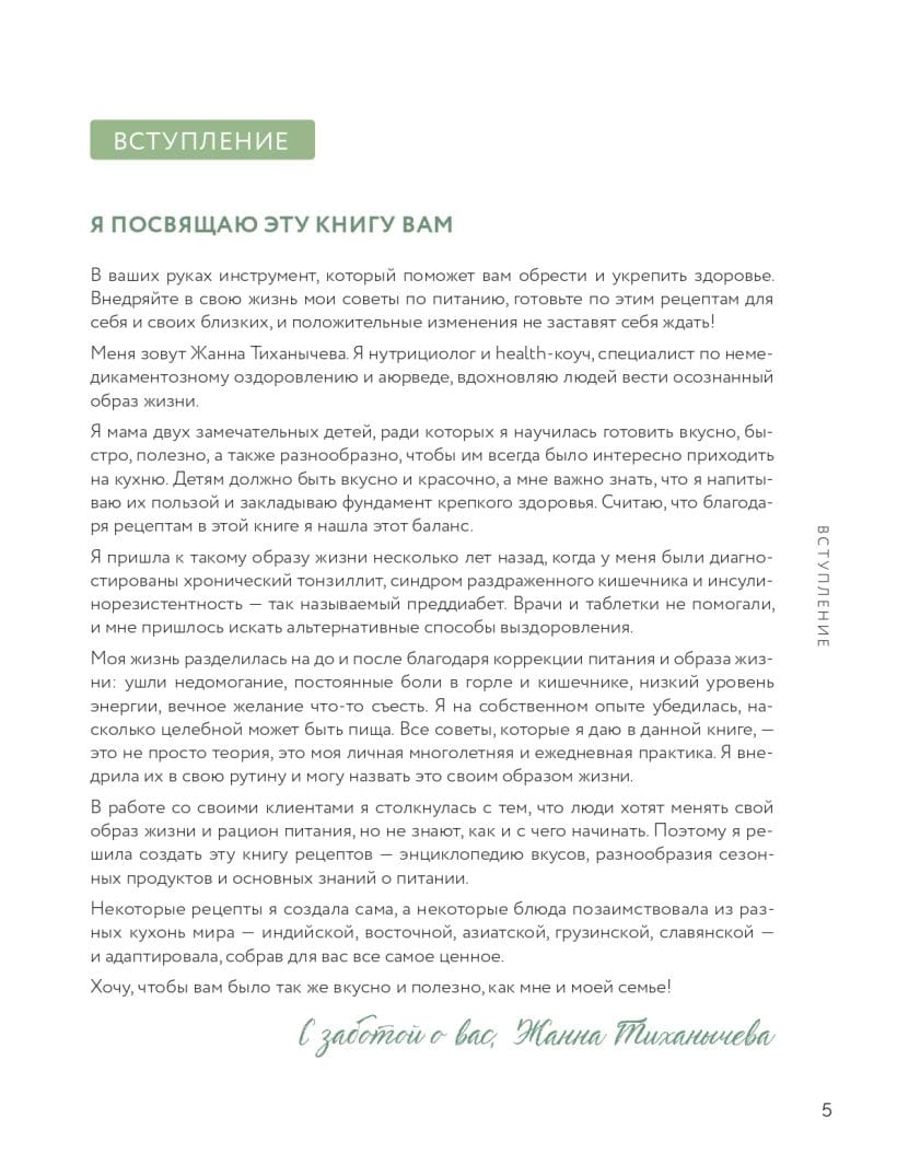 Zhanna Tikhanycheva is a nutritionist and health coach, a specialist in non-drug health improvement and Ayurveda. Her new book is not just a treasure trove of valuable knowledge about healthy eating, but a whole encyclopedia of tastes. In the book, you will find both original recipes and dishes from different cuisines of the world - Indian, Eastern, Asian, Georgian, Slavic. The author adapted them, collecting for you all the most valuable.