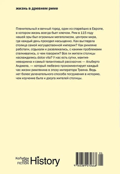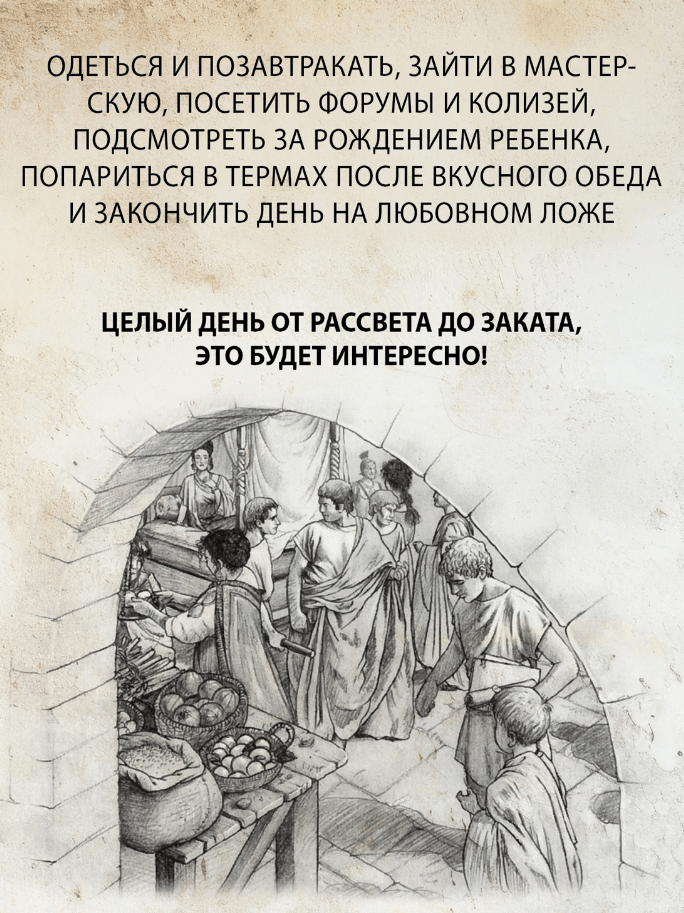 The author invites us to "put on a cap of invisibility" and spend an entire day in Rome, from dawn to dusk, in 115 AD: mill about on a crowded street and peer into the Colosseum, attend a court hearing and luxurious baths, sample exquisite dishes, and enjoy conversation at a dinner party. And end the day on a love bed—here, too, nothing has changed in two thousand years.