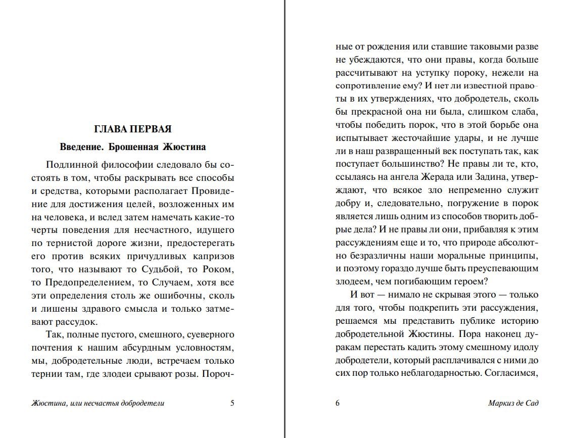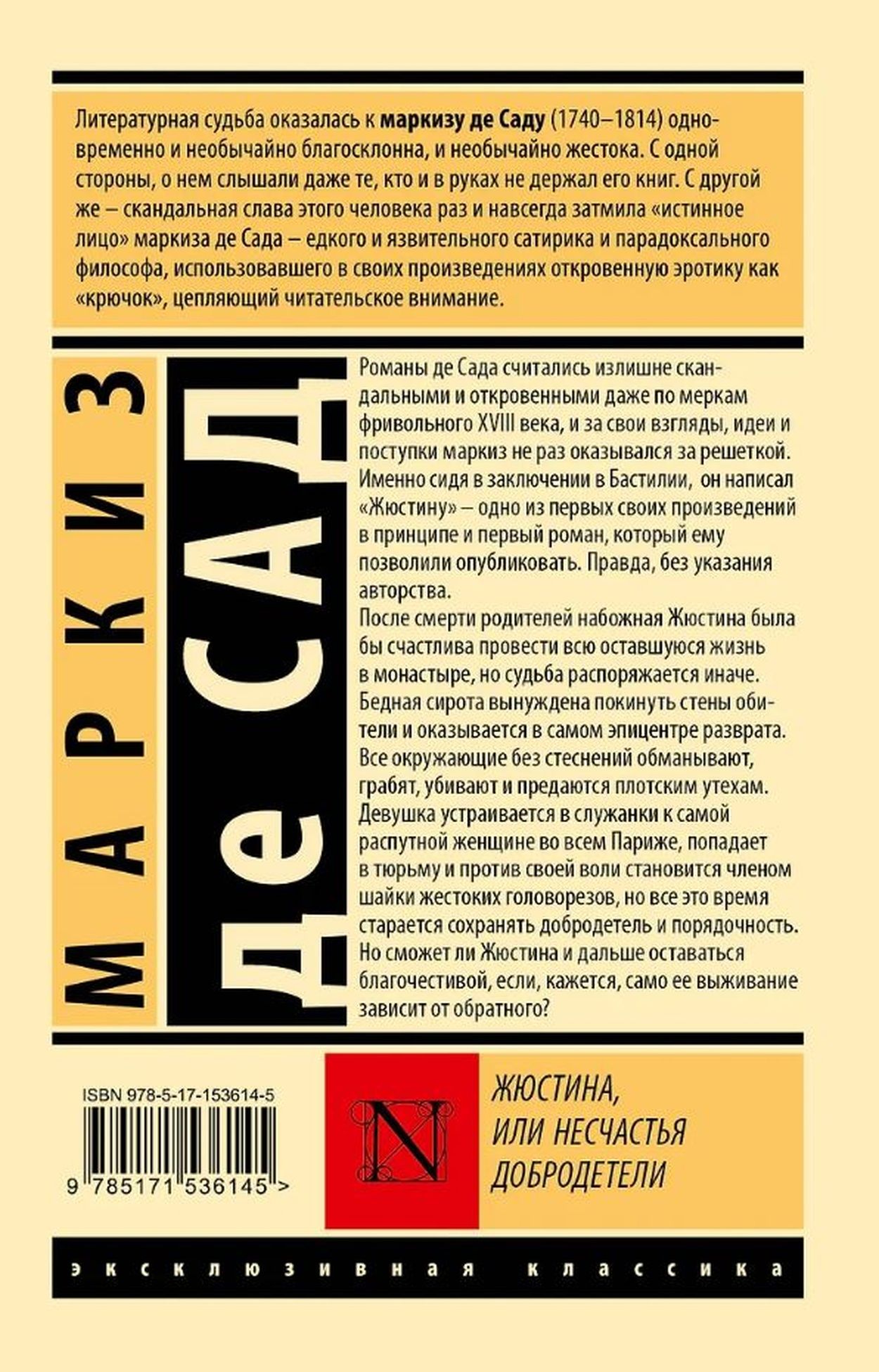 De Sade's novels were considered excessively scandalous and frank even by the standards of the frivolous 18th century, and the Marquis found himself behind bars more than once for his views, ideas and actions. It was while imprisoned in the Bastille that he wrote Justine, one of his first works in principle and the first novel that he was allowed to publish. True, without indicating the author. After the death of her parents, the pious Justine would have been happy to spend the rest of her life in a monastery, but fate decreed otherwise. The poor orphan is forced to leave the walls of the monastery and finds herself in the very epicenter of debauchery. Everyone around her shamelessly deceives, robs, kills and indulges in carnal pleasures. The girl gets a job as a servant to the most dissolute woman in all of Paris, ends up in prison and against her will becomes a member of a gang of cruel thugs, but all this time she tries to maintain virtue and decency. But can Justine continue to be pious when her very survival seems to depend on the opposite?