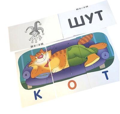 A set of picture cards from the "Entertaining Cards" series is part of a literacy training kit for children. The total number of cards in the set ensures that a child develops a complete initial reading technique. By playing with the cards and forming words, a child learns to read and memorizes the graphic representation of a word. This set includes 48 cards, which can be used to create 16 pictures. If the picture is assembled correctly, it forms a monosyllabic word. The game uses both the front and back of the card, enhancing the effectiveness of reading instruction. This resource is designed for preschool and primary school-aged children. It is used in the first stage of learning – reading monosyllabic words with hard consonants. Detailed instructions for parents are included.