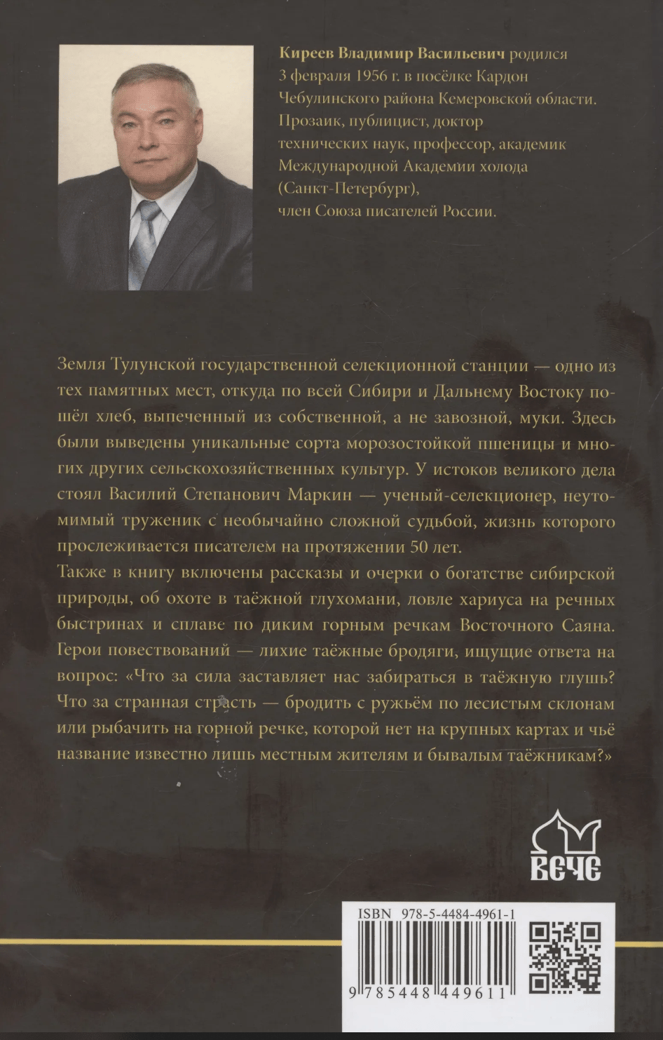 The land of the Tulun State Breeding Station is one of those memorable places from where bread baked from its own, not imported, flour began to be produced throughout Siberia and the Far East. Unique varieties of frost-resistant wheat and many other agricultural crops were bred here. At the origins of this great cause stood Vasily Stepanovich Markin, a scientist and breeder, a tireless worker with an unusually difficult fate, whose life is traced by the writer over 50 years. The book also includes stories and essays about the richness of Siberian nature, about hunting in the taiga wilderness, catching grayling in river rapids and rafting along the wild mountain rivers of the Eastern Sayan. The heroes of the stories are dashing taiga wanderers looking for an answer to the question: "What force makes us climb into the taiga wilderness? What kind of strange passion is this - to wander with a gun along wooded slopes or to fish in a mountain river that is not on large maps and whose name is known only to local residents and seasoned taiga dwellers?