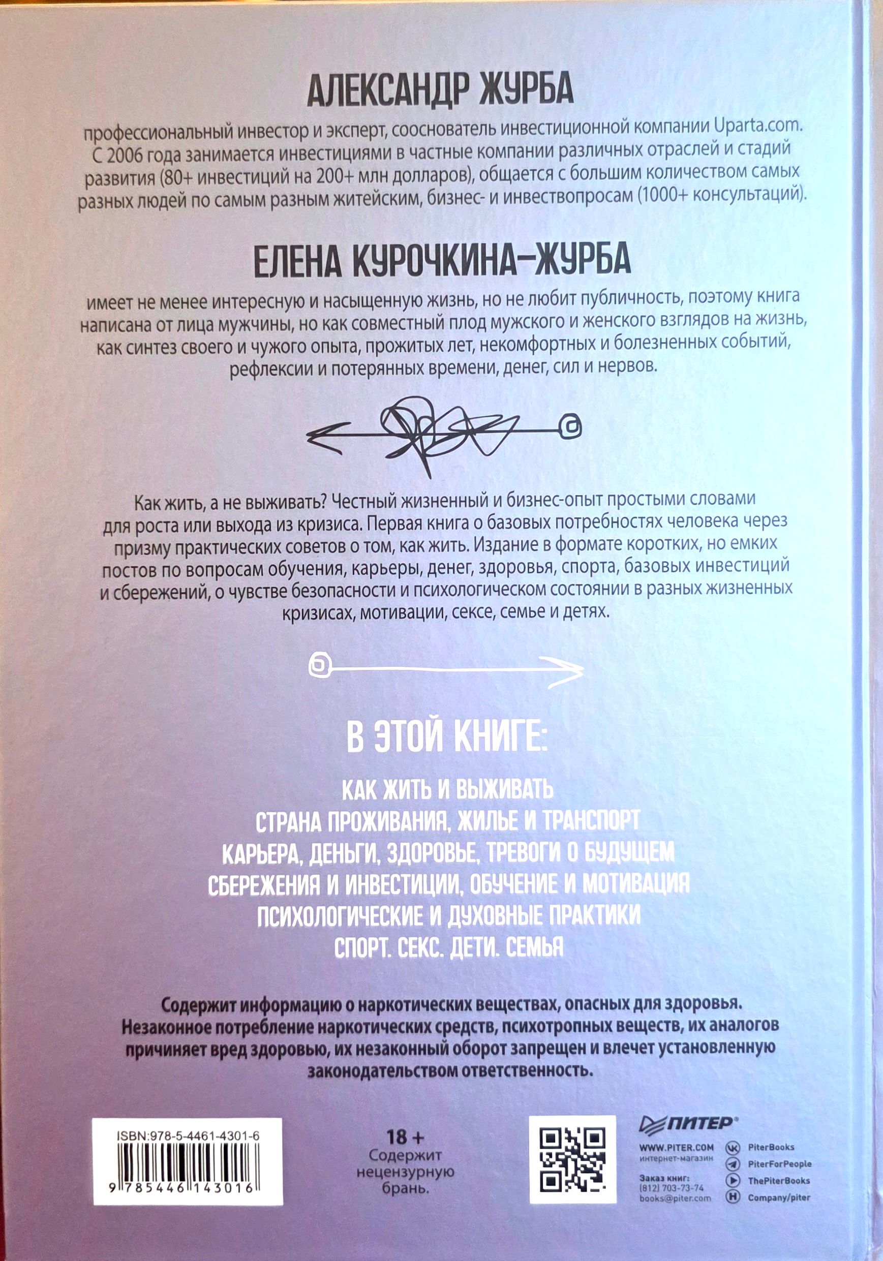 How to live, not just survive? Honest life and business experience in simple terms for growth or getting out of a crisis. The first book about basic human needs through the prism of practical advice on how to live. The publication in the format of short but capacious posts on issues of education, career, money, health, sports, basic investments and savings, about a sense of security and psychological state in various life crises, motivation, sex, family and children.