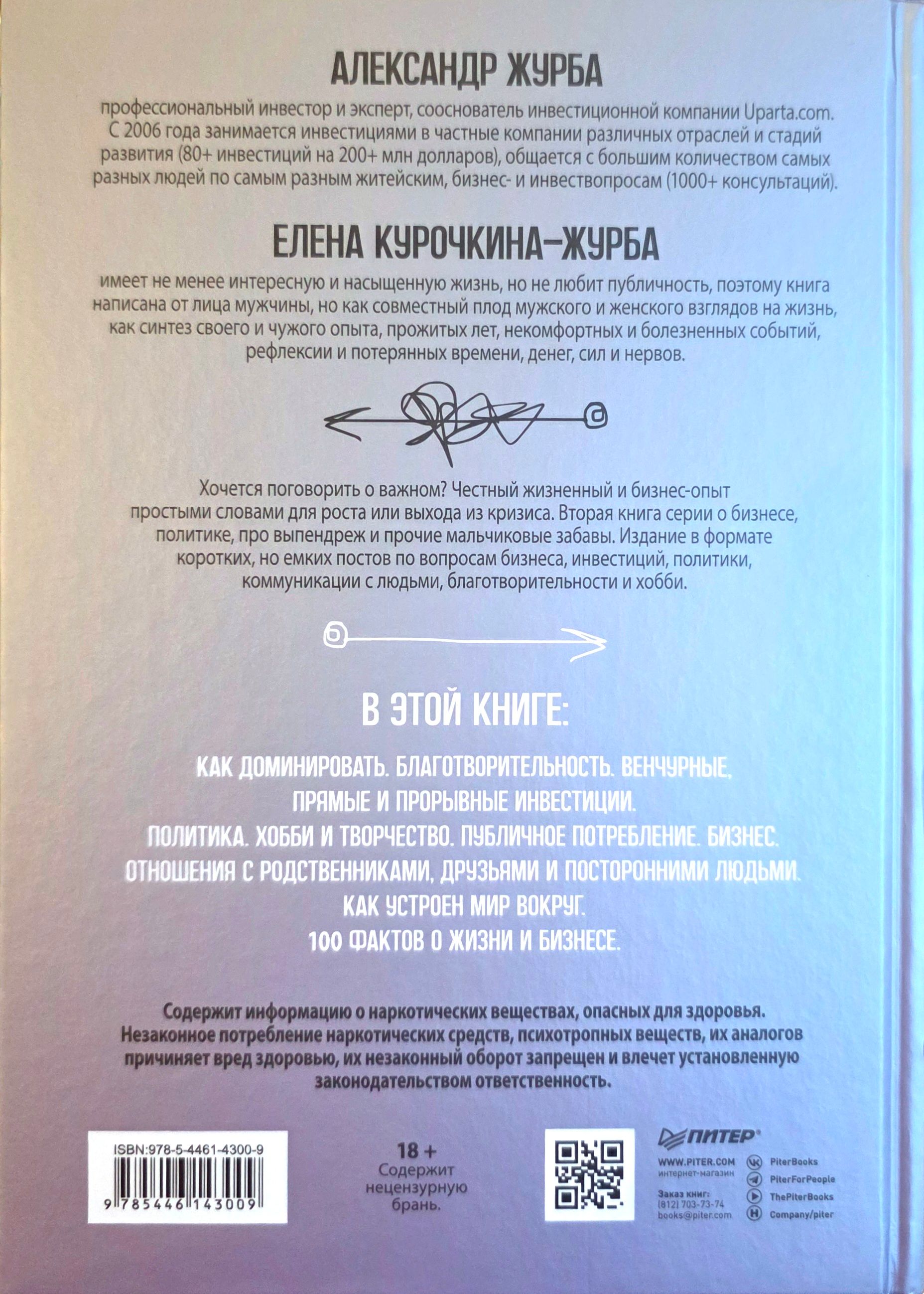 Elena Kurochkina-Zhurba has an equally interesting and eventful life, but does not like publicity, so the book is written on behalf of a man, but as a joint fruit of male and female views on life, as a synthesis of her own and other people's experience, years lived, uncomfortable and painful events, reflection and lost time, money, energy and nerves.
