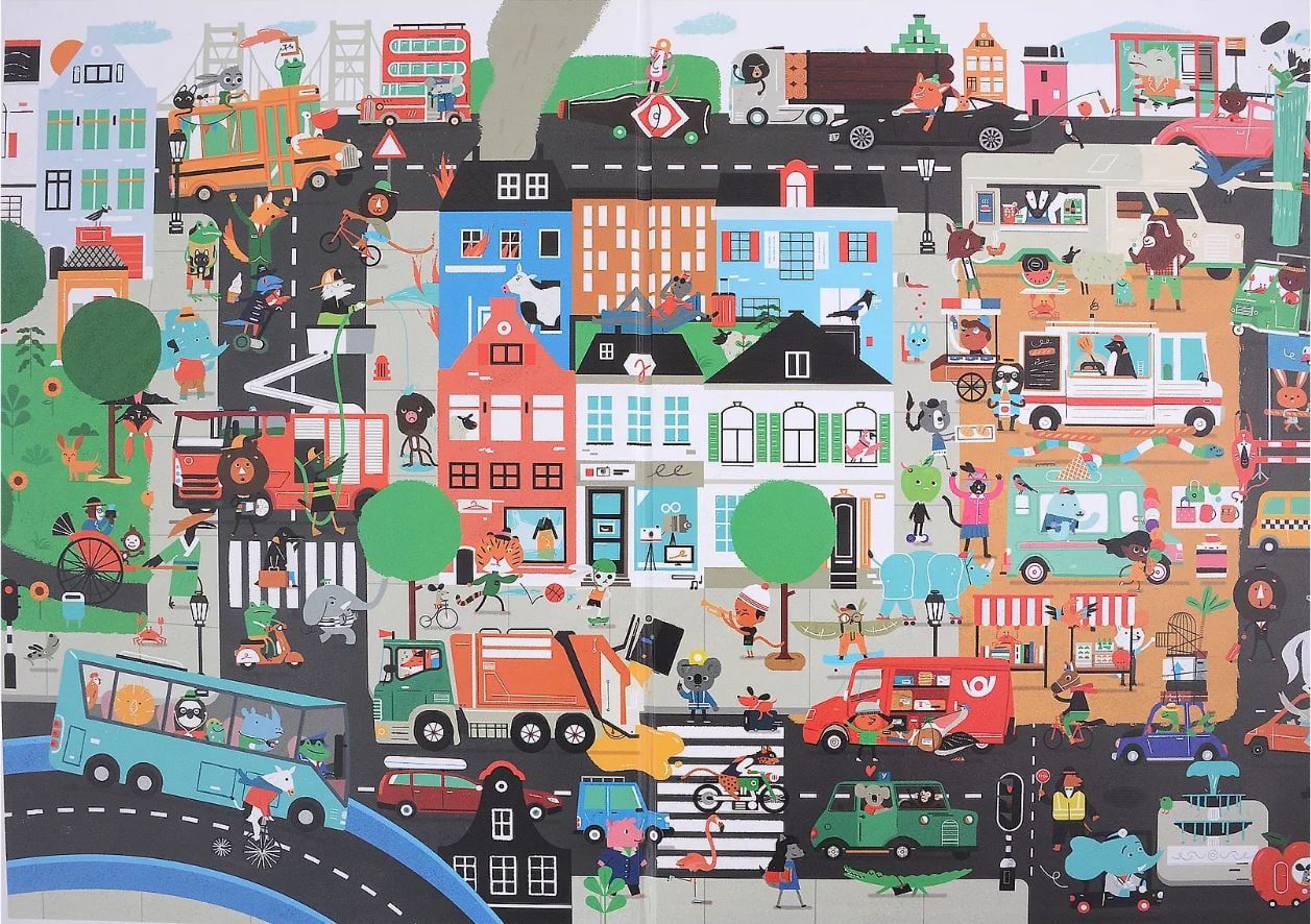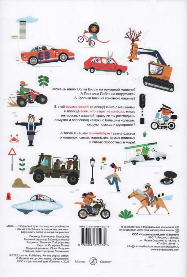 This two-meter (long) book with cars and everything that goes on wheels has many interesting tasks: can you immediately spot a limousine and a "Spider" bicycle with a big wheel, an ambulance and a garbage truck?