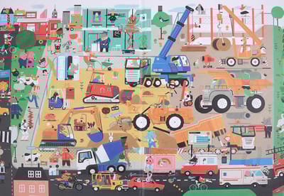 Can you spot Willie the Wolf on a fire truck? And Pablo the Penguin on a forklift? And Kiki the Rabbit on a racing car?