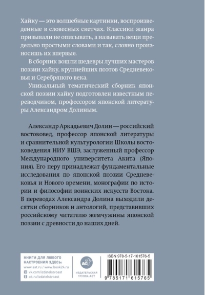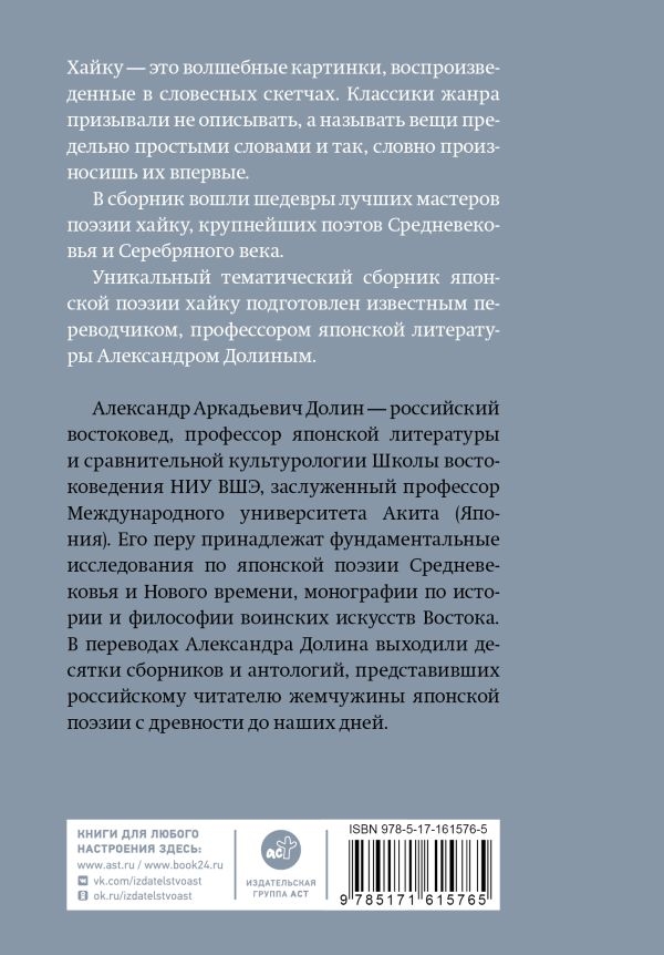 This unique thematic collection of Japanese haiku poetry was compiled by renowned Russian researcher and translator Alexander Dolin, Professor of Japanese Literature at the Higher School of Economics and Professor Emeritus at Akita International University, who lived and worked for many years in the Land of the Rising Sun.
