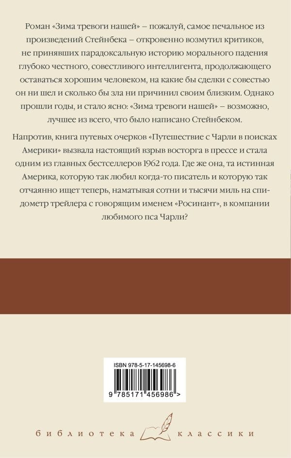 The novel "Our Winter of Anxiety" - perhaps the saddest of Steinbeck's works - frankly outraged critics who did not accept the paradoxical story of the moral fall of a deeply honest, conscientious intellectual who continues to be a good man, no matter what deals with his conscience he did not make and no matter how much evil he caused his loved ones. As the years passed, however, it became clear that The Winter of Our Anxiety was perhaps Steinbeck's best work. On the contrary, a book of travel essays "Traveling with Charlie in search of America" caused a real explosion of excitement in the press and became one of the main bestsellers of 1962. Where is it, the true America, which the writer once loved so much and which is so desperately seeking now, winding hundreds and thousands of miles on the speedometer of a trailer with a talking name "Rocinante", in the company of his favorite dog Charlie?