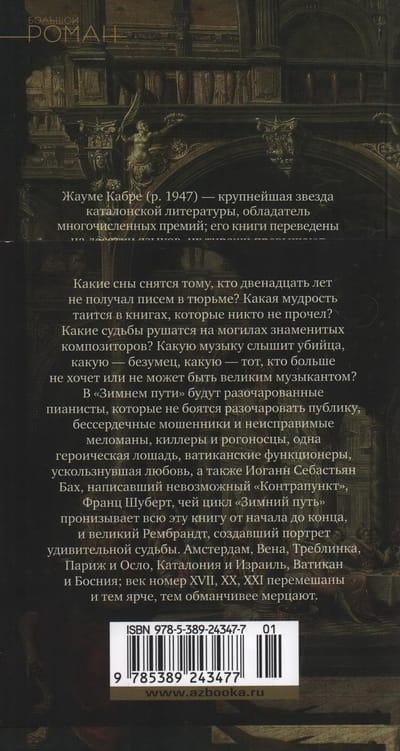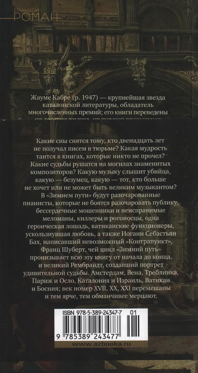 What are the dreams of someone who has not received a letter in prison for twelve years? What wisdom lurks in books that no one has read? What fates collapse on the graves of famous composers? What music is heard by a murderer, what music is heard by a madman, what music is heard by someone who no longer wants to be or can no longer be a great musician? There will be frustrated pianists who are not afraid to disappoint the public, heartless crooks and incorrigible music lovers, hitmen and cuckolds, one heroic horse, Vatican functionaries, elusive love, as well as Johann Sebastian Bach, who wrote the impossible "Counterpoint," Franz Schubert, whose "Winter Road" cycle permeates this book from beginning to end, and the great Rembrandt, who created a portrait of a remarkable destiny. Amsterdam, Vienna, Treblinka, Paris and Oslo, Catalonia and Israel, the Vatican and Bosnia; century number XVII, XX, XXI are intermingled and the brighter, the more deceptively shimmering. Jaume Cabré (b. 1947) is the biggest star of Catalan literature, winner of numerous awards; his books have been translated into dozens of languages, their circulation exceeds one million copies. His collection The Winter Road, which won the prestigious Catalan literary prize Crítica Serra d'Or (2001), is the story of desperate and sometimes despairing people who sing their own songs at the top of their voices, or to themselves, or even behind the scenes, and everything sounds like a polyphonic canon, an incredible counterpoint, a bow to Bach, Schubert, an impossible music that no one but Cabré will write.