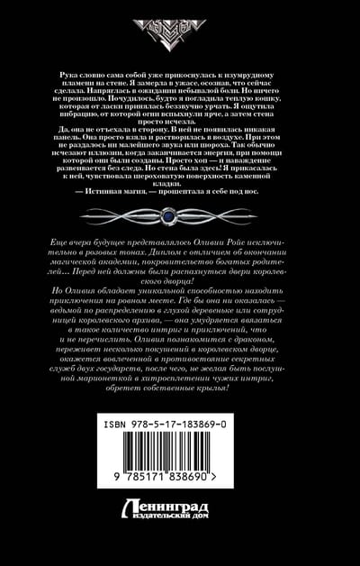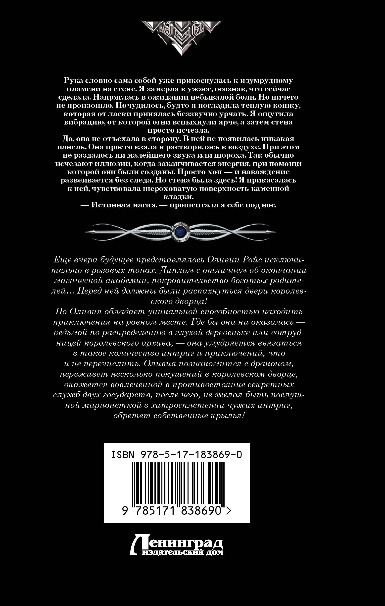 Just yesterday, Olivia Royce's future seemed entirely rosy. A diploma with honors from a magical academy, the patronage of wealthy parents... the doors of the royal palace were supposed to open before her! But Olivia has a unique ability to find adventure out of nowhere. Wherever she finds herself—as a witch assigned to a remote village or an employee of the royal archives—she manages to get caught up in so many intrigues and adventures that it's impossible to list them all. Olivia will meet a dragon, survive several assassination attempts in the royal palace, become embroiled in a clash between the secret services of two countries, and then, refusing to be an obedient puppet in the intricacies of others, she will find her own wings!